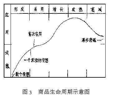 一般说来,商品生命周期可分为四个阶段:生长(引入)阶段、发展(成长)阶段、稳定(成熟)阶段、衰退(淘汰)阶段。商品从设计、研制到进入市场之前,属于潜在(孕育)阶段,不列入商品生命周期之内,见图2的阴影部分。此外,有些学者对商品生命周期采取五阶段的分法,即把图2的第Ⅱ阶段分为采用和增长两个阶段,强调了首次应用时,销售的速度缓慢增长至成熟阶段时,逐步衰退,见图3。