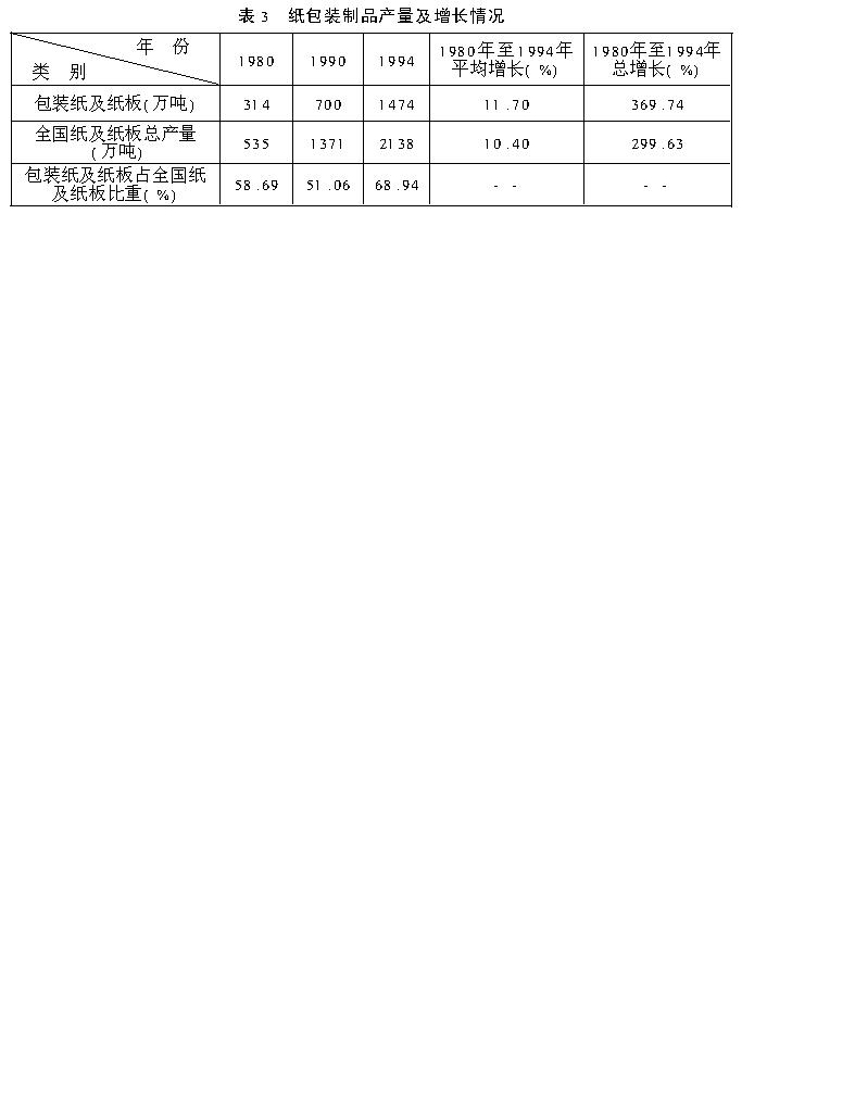 从表2中各项指标可以看出,在工业发达国家的各种包装材料中,消耗最多的是纸和纸板,一般占40%以上,特别是美国,高达48.8%。在当今节约能源与防治环境污染的国际形势下,无污染、无公害的“绿色包装”正在全世界悄然兴起,既能满足透气、防潮、抗震、抗压等多种要求,又便于回收利用且不造成环境污染的纸包装容器,与塑料、玻璃、金属三大包装材料相比,无疑会有更广阔的发展前景。 二、纸包装制品的现状及分析 1980—1995年16年中,我国纸箱、纸盒、纸桶、纸罐、纸杯、纸盘、纸浆模塑等各种造型的纸包装容器发展迅速,花色品种也日益增多。纸包装制品的原材料———包装用纸及纸板的需求量越来越大,纸包装制品的增长速度大于全国纸及纸板的总增长速度。纸包装制品的有关指标如表3。