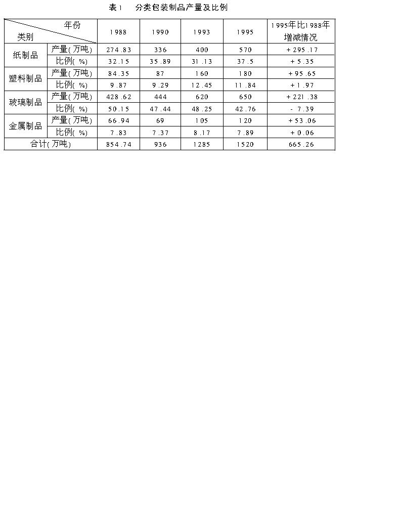 在本文研究了包装材料的四大支柱———纸、塑料、金属、玻璃等目前的应用情况后,在大量数据的基础上分析了我国纸包装的发展现状,预测了其发展前景。 一、前言 改革开放以来,我国包装工业发展很快,包装工业总产值年均递增20%,在国民经济40个行业中已跃居第16位。包装工业每年承担着30000亿元工农业产品和1000亿美元出口商品的包装任务,初步满足了国民经济发展的需要。 随着包装工业的发展,现代商品包装材料的四大支柱———纸、塑料、金属、玻璃等都有了较快的发展,详见表1。