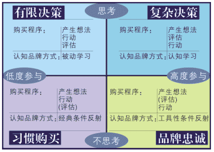 一、了解消费者 在营销过程中,企业所做的一切努力,最后都会作用到消费者身上,从消费者身上得到反馈。深刻了解消费者已成为制定营销策略的基础。 很多企业想去了解消费者,但缺乏方法和工具。因此,大多时候是在凭感觉去了解消费者,制定营销策略的。 在对消费者研究中,消费者的“购买行为”研究又是最重要的,直接与企业的销售相关。对消费者购买行为有充分了解后,企业就能有针对性的采取营销措施,提高营销成功率。 因此,了解消费者的购买行为,对企业营销策略的制定至关重要。 二、消费者的四种购买方式 以产品对消费者重不重要,我们可以将消费者分为两种:高度参与型和低度参与型。 如果一个产品对消费者很重要,如价格很贵,或者与自身形象有关,购买时有一定风险等情况下,消费者会主动的,比较深入的参与到购买中去。称为“高度参与”。 相反,像牙膏,矿泉水,食盐等产品,对消费者的影响不会很大。在购买中,消费者一般会处于比较被动的状态,对整个购买过程的参与程度也不高。因此称其为“低度参与”。 以消费者在购买产品前做不做思考,又可将消费者分为两类:思考决策型和不思考型。 以上两种情况交错,就形成了四种完全不同的购买方式。见下图: