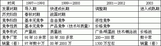 众所周知,保暖内衣作为一个从无到有的新兴产业,97年萌芽,98年异军突起,诞生至今不过6、7年间,却成就了一个数百亿的市场。6年多来,整个产业风生水起,经历了以产量为中心的无竞争、以质量为焦点的自由竞争和以传播与技术为主体的恶性竞争阶段,其间连绵不断地上演了如火如荼的数量战、质量战、广告/明星战、技术/概念战与价格战。在如此惨烈的恶性竞争中,保暖内衣是匆匆结束一个产业的导入期与成长期,经01—02年的短暂休整,业已进入了成熟期。