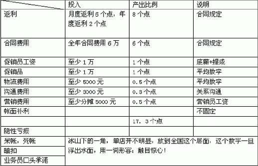 在这里,很要必要对家电连锁的经营模式进行粗略的探讨,这个现象在许多城市可以分析得非常清楚,大盘操作掌握在分部的采购与销售,财务是直属于总部的,服务单列,广告宣传有单独的部门操作进行,设定一个配送中心,对所有的门店进行配货,终端门店只是一个强大的输出端,因此,我们对家电连锁合作就可以简单的分成两块,一块在分部的业务与财务,一块是在终端的门店部分,该文将在终端操作部分进行深入的探讨! 关于渠道合作模式 目前,与家电连锁操作存在两种模式,一种是直营模式,一种是代理商模式,但是,经过实践,能活下来的只有直营模式,这是基于目前家电连锁发展现况与各个厂家的市场现况而决定的。 家电连锁是一种需要完全终端的操作模式,这是一个什么概念呢?? 大终端操作的利润核算模型 如果我们算一笔帐,我们要把花的每分钱计算到我们的运作成本(全部政策返利,销售费用,促销费用,物流费用,导购员费用,业务沟通费用,广告费分担等),我们的目标就是,将每一个店当作一个经营模型,这样我们在整个区域上就是一个大的终端操作模型,我们必须在时刻计算我们的投入与产出,必须时刻核算自己的运作成本,在渠道费用一定的情况下,千方百计的提升销量,是我们的根本目标,即便我们一台也不出货,我们在家电连锁的财务显示上照旧是不变的,多出一台货,我们的利润就多了一点,我们的运营成本就少了一点。 下面以某空调品牌与某家电连锁的单店经营情况做一下简单的分析: 空调为例: 假定销售额达到100万,按照均价最高2000元计算,将是500台销售