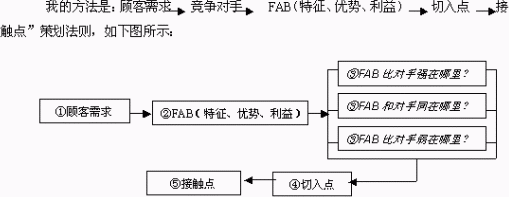 图表中第一步代表顾客需求;第二步FAB是在明白顾客需求的情况下分析产品利益点的方法,F就是产品的特征,A就是这一特点所产生的优点,B是这一优点所带给顾客的利益点,FAB原为推销工具,这里做为产品上市推广思考方法链的第二步;第三步表示在明白消费者需求的基础上,利用FAB分析工具和竞争对手作比较从而决定采取何种诉求策略(“诉求”为广告学用语,指与目标消费者沟通);由前三步的分析得出第四步消费者切入点,即策略的核心思想“何时、何地与消费者沟通”;最后第五部由此发展出消费者接触点,即选择适合目标消费者的传播工具(如广告、公关、营业推广、人员推销)、各种传播工具之间的有机组合策略及传播工具的所体现的“调性”,(“调性”是广告专业用语,指传播的风格、个性、品味等)。 下面我们以容声卡通冰箱为例来解释。用这一思维方法,策划人员首先要了解目标顾客需求。如容声卡通冰箱的定位是少年儿童市场及部分单身追求时尚的白领及时尚型家庭,这类顾客的需求主要有以下几种:卡通冰箱多种多样神奇的仿动物造型能满足少年儿童喜欢卡通形象的心理需求,儿童食物应该与大人食物分开存放的功能满足家长为小孩健康着想的心理需求;卡通冰箱的游戏功能及“电子宠物功能”能满足儿童爱玩、贪顽且希望快快长大的天性;卡通冰箱的容积段能满足部分新潮白领未婚人士追求时尚的心理需求;大学生市场需求……,为什么策划的思考方向先要研究目标消费者的需求呢?因为这是市场营销领域“铁的法则”,是公理,所有的市场营销领域内的规律如果不从目标顾客需求开始,也就意味着这样的规律是“闭门造车”。不同的顾客需求也是不同的。有时,尽管他们买同一种产品,也是出自于不同的购买动机。只有在准确把握顾客需求的基础上,才能打动顾客;如今的市场环境,同类产品越来越相似,产品之间的差异性很小,我们必须知道怎么使最小的差别发挥出最大的作用,同时还必须知道其中的哪些差别对顾客来说至关重要。由于顾客需求的个性化,某些特点对有些顾客有吸引力,而对另外一些顾客却没有;即使喜欢同样的特点,需求也各不相同;知道顾客想要什么,就能知道如何用自己的产品去满足顾客的需求。有时我们会发现顾客的需求不止一个,但通常有一个是首要的,几个是次要的。次要的需求是否要明确下来,要根据其对顾客的重要程度而定。 其次为第二步,负责产品上市推广人员要根据顾客需要,提炼出产品能够带给顾客的利益点即利用FAB法。FAB法,原是是推销员向顾客推销产品利益的分析方法,通常做为推销工具使用。这里借用为市场推广思考方法链上的一环。F就是产品的特征,A就是这一特点所产生的优点,B是这一优点所带给顾客的利益。顾客购买的不是产品本身,而是产品带给顾客的利益。如容声卡通冰箱某一处特征F是卡通的动物形象,优点A生动、活泼、美观,改变了冰箱清一色大容积(100立升以上),色彩及造型单一的形象,顾客利益点B之一是能满足少年儿童天真烂漫、极富想像的天性。 在产品高度同质化的领域如家电、日化、保健品领域,各厂家的产品的技术含量实际上不可能有本质的差别,除了要分析顾客的需求,还得分析竞争对手。这样发展与目标消费者沟通的手段、组合策略以及这些沟通手段体现出来的“调性”上才能更加“有的放矢”。因此,第三步,还需要了解顾客如何看待竞争对手的产品。我们应利用FAB法则从三个方面来同竞争对手的产品作比较:暨我们的产品比对手强在哪里?我们的产品与对手同在哪里?我们的产品比竞争对手弱在哪里?第一种情况,在传播诉求上必须继续建立产品在顾客心中的良好形象,诉求我司产品是如何的优于竞争对手,并且表明我司的产品所能提供的附加值。第二种情况,产品与对手的产品的基本相同,在这种情况下,必须强调我司的产品能满足需求,然后以另一种策略来告知顾客我们的产品带来的利益要优于对手的产品。第三种情况,我们的产品弱于对手的产品,在这种情形下,可以考虑避实就虚,承认自己的产品不足,然后转移消费者注意力,诉求另外一种产品利益点。 新产品的上市推广思考的全过程总的来说主要完成三个方面的任务:“对谁说(目标消费者是谁?他们的需求是什么?)——说什么?(提炼与消费者沟通的利益点)——怎么说?(寻找与消费者沟通的途径与发展消费者沟通的手段)”。通过前三步的分析,我们解决了前两个任务,即对谁说,说什么的问题。怎么说的工作是第四步的任务,就是寻找与消费者沟通的途径暨消费者切入点。所谓消费者切入点,乃是决定何时、何地与目标消费者沟通。如容声卡通冰箱主要定位为少年儿童市场,那么,消费者切入点方面,时间应是寒、暑假或放学后六点到六点半钟,六一儿童节等。地点为家电类冰箱专柜、儿童用品商店、少年宫、动物园、麦当劳、肯德基、学校等少年儿童乐于出没的地方。 最后一步即第五步,所要解决的问题是消费者接触点,所谓消费者接触点,是指在前四步的基础上,发展与目标消费者沟通的手段、手段之间的有机组合策略以及这些沟通手段体现出来的“调性”。如容声儿童冰箱根据对目标市场的研究沟通手段可以是儿童杂志广告,报纸儿童专栏,广告电视儿童节目广告;儿童绘画比赛公关;终端卡通人物导购、儿童