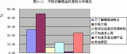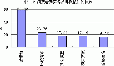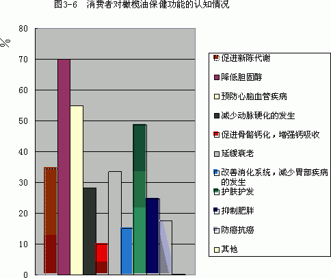 一、消费者对橄榄油保健功能及用途的认知度 由于橄榄油具有预防心脑血管疾病、降低胆固醇、延缓衰老、护肤护发、防癌抗癌等功效,广大消费者对橄榄油具有较高的认知度。据调查显示,70.10%的人了解橄榄油可以降低胆固醇,55.05%的人知道橄榄油可以预防心脑血管疾病,48.76%的人了解橄榄油可以护肤护发,只有0.19%的人不知道橄榄油对人体的益处(如图3-6)。由此可知,大部分消费者了解橄榄油对人体的益处。 同时,消费者对橄榄油的用途也具有较多的了解,据调查,77.71%的人认为橄榄油的主要用途是做凉拌菜或沙拉,56.38%的人认为橄榄油的主要用途是炒菜或煎炸食物,而不知道橄榄油的用途的人最少,仅为0.19%(如图3-7)。 二、市场竞争日趋激烈 由于中国橄榄油市场具有巨大的潜力,但中国的地理环境并不适合大量生产橄榄油,因此一些国外知名的橄榄油品牌近年来争相逐鹿中国市场。据调查可知,国内的消费者也对国外的橄榄油比较认可,其认为最著名的橄榄油生产国主要有西班牙、意大利、土耳其、希腊、法国。仅有4.76%的被调查人员不知道著名的橄榄油生产国。 此外,各橄榄油品牌的竞争也是互具特色,各有千秋。各品牌在各地市场表现不同,一些品牌在相应地区具有了绝对的品牌优势,例如本品牌橄榄油在北京的品牌知名度达到70%以上。现根据各橄榄油品牌的知名度排列如下:A品牌、乐家、大树、太阳谷、品利,最后就是亿芭利、甘达和华源生命。 三、消费者购买橄榄油习惯调查 橄榄油根据其提炼程序不同有不同的等级,最好的橄榄油是初榨的,其次是纯正的,最差的是渣油。调查结果表明,在中国市场大部分人购买初榨橄榄油(如图3-10)。 同时,未购买橄榄油的原因调查也显示价格相对较高是消费者知道其优点但仍未购买的主要原因(如图3-11)。看来橄榄油要大规模飞入寻常百姓家、在中国普及还有待居民收入的进一步提高。