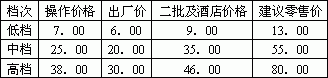 注:操作价格为成立直销公司向外批发的价格。中间差价用于广告宣传及促销。其中低档酒以走批发跑量为主,中、高档直接做终端,不走批发渠道。