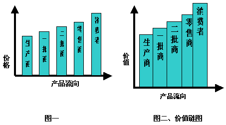 到网上进行搜索,关于价值链的链接达几十万条!再仔细查查,竟然基本上没有一条能对渠道具体操作有用!供应链、价值链、物流、价值、知识、增值……各种类型的概念性词语充斥其中,却没有一条能清晰地得出产品流通过程中为什么要进行渠道管理、要进行渠道成员调整、要进行渠道模式的变革、要进行渠道成员的培训和提升等等我们正在对渠道进行大刀阔斧的动作的一丁点理由。 我们发现,我们对渠道的基本定义就是:产品流通过程中的一员。我们都在讲渠道的价格体系,但只停留在产品的各个节点的具体的数据方面,我们根本不能通过渠道定义和价格体系来说明越来越复杂的从企业—渠道成员—消费者的整体内涵。 渠道研究,竟然没有一个理论作为基础!渠道调整及改革,竟然没有一个站得住脚的观点作支撑!现在非常之火爆的深度分销渠道运作原理,也不能从根本上来支撑和解释不同的渠道运作和管理体系! 我们发现,只有渠道价值链原理,才能让我们懂得如何去进行渠道运作与渠道管理。渠道价值链原理,就是渠道运作与管理要遵循的潜规则! 而我们对渠道价值链这个词虽然非常熟悉,但还是完全停留在非常肤浅、非常表面的似是而非的了解上。要不然,为什么我们现在还一直在蒙蒙盹盹:窜货一直没找到根本的解决办法(事实上也没有根本的解决办法,而很多人还在非常兴奋地向外界传授所谓的“经验”);经销商的整体水平的提升不知从何做起(经销商现在困惑死了!许多专家在想办法,却都不能从根本上解决他们的问题!);为什么要将经销商替换的解释只能是“不听话”(经销商本来就是单独的经济实体,为什么要完全听企业的话?)?…… 张经理在快速消费品行业摸爬滚打了近十年,最近给一些企业的中高层作销售管理培训时,讲到了价格体系,每次都发现一个相同的现象,那就是在讨论价格体系的时候,所有的学员都认为价格体系应该是一个递增的柱状图(如图一所示):