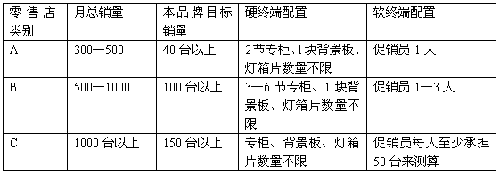 下文就以“五个到位”原则来阐述终端营销管理和终端营销支持系统建设。 一、终端营销规划 任何规划都是在解决“目标——行动——资源”问题,即明确要达到的目标,为了达到目标需要采取的行动,采取这些行动需要投入的资源。 终端营销的目标就是零售量目标,要完成零售量目标,简单来说,就是开发足够数量的零售终端,并提高每个零售终端的销量。 1、如何开发足够数量的零售终端? 关键是对所有零售终端的分布情况有非常详细的掌握。 在手机行业,运营比较成熟的手机厂商和代理商,每年都要进行1-2次的零售终端普查,只要看到其中一家的零售终端普查资料,就可以很清楚的了解到每个城市的市场容量是从哪些零售店卖出来的。将这些零售店根据销量情况进行分类,每一类零售店确认不同的销量目标,销量从大到小排列,从大到小选择每一类零售店,这样需要开发的每一类零售店数量就清楚了。 2、如何提高每个零售店的销量? 就是所谓的终端营销管理的“五个到位”,所选择的零售店的五个关键因素都能达到较高的水平,这样,每个零售店的销量,乃至所有零售店的销量提升就有了坚实的保障。 要确保所选择的零售店的“五个到位”能够达到较高水平,一方面需要足够的资源投入,另一方面,需要相应的职能部门予以系统的支持和配合: 1) 将每个零售店达到“五个到位”所需要的资源数量(促销员、背景板、专柜、促销活动资源等)加起来,就是终端营销所需要的资源总量。 2) “五个到位”的后面是相应职能部门的支持和配合。这个问题将在“终端营销支持系统建设”中有详细的叙述。 3、终端营销预算(测算投入终端资源的数量及金额) 终端营销预算包含进行软硬终端建设的所有费用预算和促销推广活动资源(宣传品、促销礼品、执行费用等)。 终端营销预算的逻辑过程具体如下: