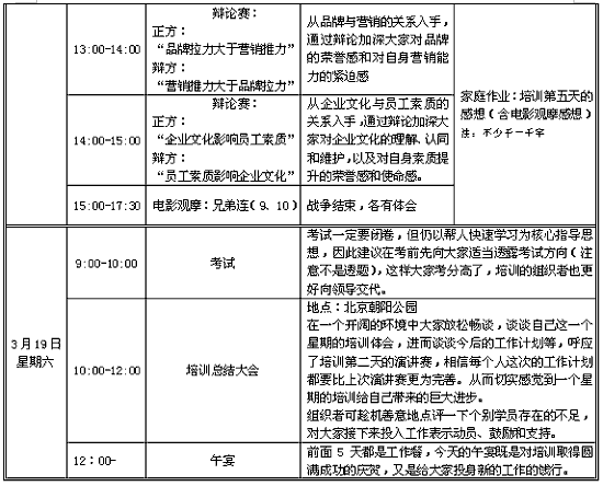 前言: 今年3月中旬,我为北京冰山三洋公司的营销类新入职员工编排了为期一周的培训课程,没想到取得了超出预期的成功:上到公司老总,下到受训学员,中间有公司的部分老员工,得到了大家的普遍认同和一致好评。其实在这一个星期的课程中我只讲了星期四上午半天,并主持了两场辩论赛,仅此而已。其他项目更多是以组织者的身份出现的。 在培训结束之后的第三天,我又仔细分析了这一星期课程的安排,深感这次培训的成功是与课程的科学编排分不开的。于是我便根据自己长期养成的总结和提炼的习惯,将原来的培训课程表“改装”了一下——隐去了各课程讲师的姓名,并充分站在培训组织者的角度上,着重增加了每个课程的内容简介和课程的意义说明,以使这份“改装”过的课程表能成为大家以后在企业内部组织培训课程时的“教参资料”。也权作是对大家在培训方面的一种经验分享吧。 其“改装”过的课程表如下:
