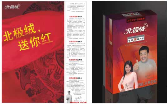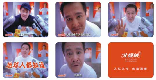 策略确定之后,我们决定继续延用赵本山为代言人,毕竟北极绒已经打上了赵本山的烙印,抹掉这个烙印不现实也没必要,但在赵本山的使用上,必须围绕策略进行,充分用足赵本山的名人价值。 因此就有了赵本山的采访篇电视广告。 赵本山坐在台上,前面摆着几个采访话筒,开始了他的赵氏风格的摆呼: “看电视烦广告,地球人都知道。 北极绒今年又请老赵,听完你再换频道。 保暖衣品牌真不少,北极绒今年又有 策略的执行——电视广告:用足赵本山 策略确定之后,我们决定继续延用赵本山为代言人,毕竟北极绒已经打上了赵本山的烙印,抹掉这个烙印不现实也没必要,但在赵本山的使用上,必须围绕策略进行,充分用足赵本山的名人价值。 因此就有了赵本山的采访篇电视广告。 赵本山坐在台上,前面摆着几个采访话筒,开始了他的赵氏风格的摆呼: “看电视烦广告,地球人都知道。 北极绒今年又请老赵,听完你再换频道。 保暖衣品牌真不少,北极绒今年又有新奥妙 更软更薄,款式时髦,保暖透气,出汗不潮。 保暖衣你总得弄一套,信广告不如信老赵, 怕冷就穿北极绒,这事——” 画外众人:“地球人都知道” 赵本山:“换频道” 旁白:“又红又专,创造温暖,北极绒保暖衣” 新奥妙 更软更薄,款式时髦,保暖透气,出汗不潮。 保暖衣你总得弄一套,信广告不如信老赵, 怕冷就穿北极绒,这事——” 画外众人:“地球人都知道” 赵本山:“换频道” 旁白:“又红又专,创造温暖,北极绒保暖衣”