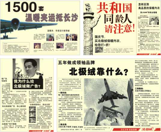 在《赵本山·采访篇》中,充分发挥赵本山语言天赋,为他量身定做了一个实话实说的创意脚本,一开场就迎合百姓心理——“看电视烦广告,地球人都知道”; 然后,在轻松幽默的过程中,传播了产品的专业品质:面料——“更软更薄”;款式——“时髦”;技术——“保暖透气,出汗不潮”; 再然后,巧妙延续了北极绒以前的广告语:“怕冷就穿北极绒,地球人都知道,”重新唤起消费者的记忆; 最后,还杀了一个赵氏风格的回马枪——“换频道!”让人忍俊不禁。 在整个告白过程中,还透着企业的实在和对消费者真诚。从脚本创意到拍摄手法没有花拳透腿,但记忆点鲜明,赢得了消费者的普遍喜爱。 保暖内衣做名人广告,除了攀比谁家明星腕儿大,除了靠名人摆酷摆造型外,除了让名人搞笑搞怪,似乎毫无办法。《赵本山·采访篇》无疑提供了一种新的模式。 广告投放之后,获得了消费者的普遍喜欢,广告播放3天后,我们在东北进行广告效果跟踪调研,结果让人非常兴奋,许多消费者反映,只看了一遍就记住了,一些消费者说这样的广告想多看几遍,但因为当时的价格战影响了广告预算,该片播放频率不高。值得庆幸的是,这支电视广告使有限的预算,发挥了最大的效果。 策略的执行——平面广告:深度说服,正本清源 除电视广告之外,我们炮制了一系列平面广告,对消费者进行深度说服,为保暖内衣正本清源。 平面广告是深度说服的工具,对于存在信任问题的保暖内衣行业,本来是有效的解决之道,却很少被保暖内衣广告利用起来,既使用了,也没有用好,没有发挥它应有的杀伤力。 从保暖内衣的平面广告来看,就有以下硬伤,导致广告预算的大量浪费: 1、 什么都想说,什么都没说到位。没有重点,蜻蜓点水,面料怎样?有什么科技含量?都讲了一些,但哪一点都没有讲透彻,讲明白; 2、 枯燥单调,功能罗列,玩概念、玩术语,不具可读性; 3、 设计粗糙,既不具美感和创意,取得品牌视觉传达的效果;又不能与报纸融为一体,取得新闻性软文的效果,阅读率低。 2002年的北极绒平面广告,没有盲目追求画面的漂亮,而是充分利用其深度说服力,除少量硬广告和促销广告外,主要采用平面软文,多角度诠释“又红又专”,谈企业的诚信、深入谈产品的面料、工艺和科技含量。更重要的是,使北极绒的品牌更清晰地凸现出来。 比如—— 《赵本山:我为什么给北极绒做广告?》,以采访赵本山的新闻形式,借赵本山之口,说出北极绒到底好在哪里。 《1000万中国人穿北极绒过冬,北极绒为什么?》:从品质、信誉、科技等方面进行论叙。