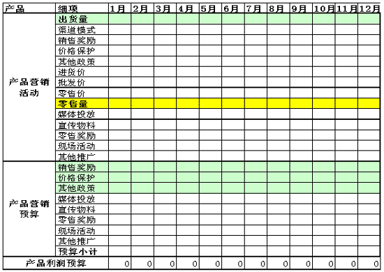 说明:1)营销活动包含价格体系的制定,价格影响销售额,进而影响利润;2)营销活动决定销量,销量影响销售额,进而影响利润;3)营销活动是要投入的,有投入就有成本费用,成本费用影响利润。 作为一个经销商,所能采取的营销活动主要几个方面: 1)渠道模式:直供零售店还是二级分销,或者是两者的结合; 2)价格体系的设计以及后续价格体系的调整; 3)销售政策(返利、提货奖励、价格保护等); 4)财务政策(铺货、帐期、鼓励回款政策等); 5)市场推广活动(在厂家宣传品的基础上增加一些物料品种,组织小型的路演,阶段性促销活动); 6)售后服务政策,迅速解决换机和修机问题。 这些营销活动的执行和调整一方面带来销量(销售额)的变化,另一方面,一定会带来相应的成本费用变动,如何实现利润的最大化,可以用以下《产品营销计划表》进行管理。