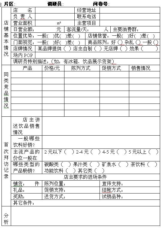 便民店铺是饮品终端的市场核心部分,具有分布面积广、经营规模小、消费群体宽及信息反馈快等特点,对上市的新产品来讲,可通过对便民店铺的开发与推广,加速市场拓展步伐,并逐步形成以零售终端拉动其它销售渠道,从而全面提升大众化消费群体对品牌的认知度。具体操作可参考以下行销策略: 一、便民店铺对饮料产品的要求: 二、便民店铺的调查与选择: □ 根据自身产品特点与市场竞争状况,确定调查的时间、范围、数量、方法及投入的人力、资金等计划安排。 便民店铺调查分析表 □ 每个目标市场应详细划分片区,可根据经济的强弱、人口的密度划分,也可按按网点的分布情况均衡划分,一般省会城市或地级城市也可按当地行政区域划分执行。 □ 每个片区可组成一个营销小组,小组人员8~15人比较适宜,每个小组除有1名小组长外,还应有1名执行督导。 □ 每可由业务代表直接负责店铺调研工作,这便于做好以后的市场推广,但须事先加强对业务代表在这方面的专业知识培训。 □在调查过程中,要实地考察与现场了解相结合,店铺规模、形象可以从外观看出,而客流量、货流量及同类产品等市场情况就需要深入的调查访问。 □ 通过对零售网点进行“地毯式”拜访,介绍产品优点、说明销售政策,为方便执行调查,可给被调查的顾客或商铺赠送些小礼品。 □ 以上店铺中,位于任一地段的口岸店、中间店,属中档层次以上的副食店或综合店均可设为A类目标客户,作为开发“样板店”的对象;“样板店”的选择宜找地处街道两端和中间位置、具有一定影响力的店铺,其比例为10:1、选择数量一般每500米长距离1-3家(或每条街1-3家)。 □ 根据调查结果与拜访情况,选择实力强、信誉好的经销网点,并说服其经营本产品。 三、扎营式铺货: □ 店面招牌、场内POP张贴、DM宣传单应随铺货同时完成。 □ 首次铺货以1-2件产品为宜,夏季可适当多些。 四、生动化陈列: □ 争取窗口处产品陈列区的排面,有条件的企业可在柜台口专门设立一个产品展示货架。