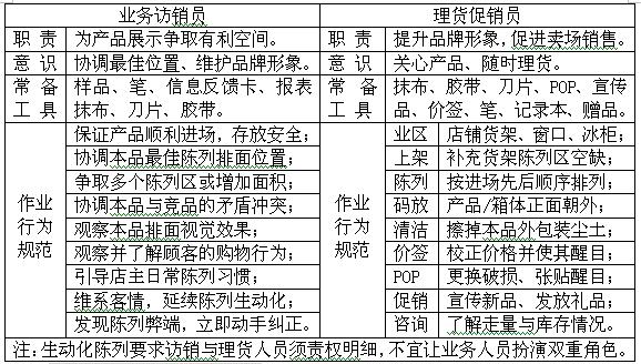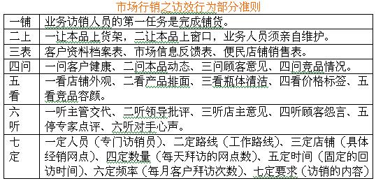 □ 产品的陈列应选择店铺的最佳视觉点,陈列排面应优于同类竞品。 □ 如产品系列比较丰富,应通过组合优势、以“岛型”、“圆型”、“梯形”或其它抢眼的堆放方式提高受众率。 □ 场内宣传品或导购卡片应投放于店外顾客能目击的有效视区。 五、创新促销推广的手段: □ 对于校区店铺可不定期开展促销活动,如:买瓶饮料可根据青少年心理需求特征送一张明星照片、一张卡通画片或文具用品之类的小礼品。 □ 对于社区店铺可在较为集中的大型社区搞些免费品尝、现场赠送等促销活动。 □ 可利用节假日在闹市区域或沿街要道的店铺附近散发宣传单、赠品或带有广告标识的鲜花、气球、牙刷等小礼物。 □ 利用“捆绑式”销售,把小礼品或赠品(也可随其它知名度高的产品)包装在一起,从而刺激消费者的购买欲望。 □ 除对顾客执行“消费有奖”外,还应对店主施行“销售有奖”,奖品可以家庭日用消费品为主,农村市场还可施行奖励农用化肥、工具等政策,以提高其推销热情。 □ 创新终端宣传品设计,提高海报、吊牌、挂期、店招的视觉效果,有实力的企业,可在样板店设置一个具有动感效果的小型灯箱。 六、深度访销维维系客情: □ 完成了首次铺货之后,深度访销与深度促销都应同时加强,从而促进产品的“下架”速度。 □ 在深度访销工作中,主要通过多次带货回访形式提升终端店铺的销量,同时促进客户加深对业务代表与品牌的印象,以刺激其经销欲望。 □ 业务人员主要通过定期拜访,征询客户意见、了解产品销售形式、售后情况、竞品差异,并通过店主了解顾客的反馈意见,同时积极协助店主开展销售,并认真收集、整理、汇报市场反馈信息。 □ 向店主介绍产品的性能、优点,协助店铺做好促销,引导、培育店主的主动推销意识,提高其对品牌的信任、对产品的信心。 □ 通过深度访销,优化网点结构,淘汰弱势店铺,保持持续稳定的终端市场。 七、终端信息的收集整理: □ 客户信息:客户的位置、规模、信誉及在经营过程中产生的一些情绪变化,包括客户的爱好、心理需求等情况。 □ 本品信息:产品的铺货、上架、陈列、走量、库存、需求等情况,主要指市场销售方面的动态。 □ 竞品信息:同类产品的价格、促销情况及对我品牌作出的应对策略等市场综合信息。 □ 消费群体信息:目标消费群体对本品或其它同类产品的反馈意见。 □ 消费环境信息:整个消费环境的变化情况,包括大众消费群体的经济水平、消费能力、口味喜好及新的消费趋势。 □ 竞争环境信息:整个饮品市场的竞争格局及发展态势,包括本品在竞争环境中所处的优、劣位置。 □ 促销信息:通过促销活动对店铺走货所产生的影响,可明细到一张海报、一个赠品所带来的效果,同时也包括竞争对手的促销举措等信息。 言之,终端市场信息错综复杂、千变万化!只有通过深入持久地开展信息收集工作,才能有效掌握市场一手资料,从而加强公司对便民店铺市场的开发、管理和调控!片区营销人员根据实际访销与了解情况,要善于进行信息的整理和分析,从中发现问题后要及时汇报、以供团队研究,通过群策群力找到解决办法,达到促进市场拓展及提高防御能力的目的。 |