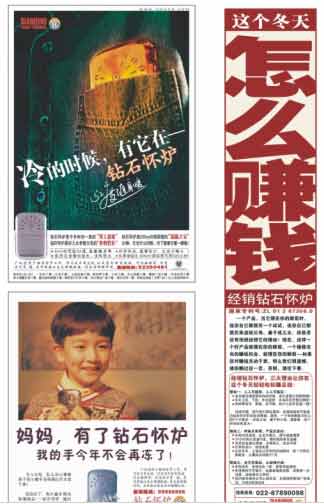 方法:两人一组一辆推车(或固定展台),一人演示产品,一人售卖。在超市卖场、百货商场、学校、小区的大门口进行。在现场,重点突出这样一句广告语:手冷的,过来暖一暖! 可想而知,在那么冷的时候,谁不想过来暖和一下?活动效果不言而喻,最好的一天,单一个柜台,就卖了200多个。138元还贵吗?消费者认为,值了。产品一上市,就引来了眼球,后面的路,自然越走越顺畅。 媒介造势体现价值的执行力 媒介的计划与实施,最能反映一个公司的执行力。钻石怀炉前期的铺垫工作做完之后,上市在即,一算才发现,媒介费用只有20万了。如何利用这笔钱,在上海闹出个动静来,我们为客户度身制订了周密而丰满的计划,媒介策略的核心简短为一句话:多频次露出。 按照常理,在上海上一个通栏,得要3、4万元,这样一来,20万也就是5、6个通栏,作为新产品,即使做得再好,要让消费者留下印象,提醒购买,也是不太可能。为此,在媒介计划里,我们特意选择了两份报纸:申江服务导报及新闻晨报。选择了性价比极高的半通栏形式作为常规发布,另外,在上市初期及圣诞节期间,我们还选择了“报头”这一形式,通过显目的创意,有力地传达了品牌特性,达到了亮相和即时购买的效果。 在半通栏的创意上,我们用了软文硬做的形式,充分结合时令造势,作时效性的发布,在年底,配合执行了一轮团购,实践证明,我们的媒介计划高效、有力,为客户创造了翻倍的价值。 经过上述几步环环相扣,紧锣密鼓的工作,在不到四个月的时间里,钻石怀炉真的实现了1:10的投入产出目标,顺利在上海站稳了脚跟。同时,通过操作钻石怀炉这个项目,我们还为普纳科技旗下,诸如此类的“小产品”,找到了一个共同的出路——坚持多品牌策略,打造中国的“时尚科技”王国。且当我们设想的一个品牌愿景,希望再次引起客户的共鸣。 回过头来,检视整个合作的过程,除了为客户带来了销量的增加,品牌知名度的上升,我们从中还是可以得出很多东西。现在的一些策划(广告)公司,无论是比稿,还是拉单,通常更多的是冲着一些有名气,有资金实力的所谓大客户,而对一些中小企业、小客户、小产品,往往不屑一顾。 实际上,在目前的中国,有越来越多的,刚刚起步的中小企业,它们缺的往往不是人力、不是资金,而是一套正规的、行之有效的,真正能为其带来看得见的销售业绩增长的真本领,这种真本领,说到底,是一种作战思想,其实则就是两个字:实效,实效的策划与传播。 作为一个策划(广告)公司,如果能够真正充分利用好企业手中的资源,用一种“四两拔千金”的力量,为企来带来真正的真金白银,或许,这更能够考验一个广告公司的策划水平和创意水平,或许,这才是企业挑选策划(广告)公司的终极理由,因为很简单,从无到有,这样创造出来的品牌,往往更见实力。 另外,钻石怀炉这个案子或许还可以给广告人一个信心:即使再小的投入,只要策略对路,同样可以出彩,同样可以为销售和品牌做出大的贡献。这才是广告的价值所在,这也才是负责任的广告行为,因为它对得起客户,对得起自已。
