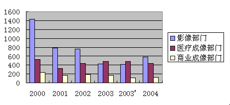 财务方面,柯达在进行了一系列战略和运营方面的调整后,已经止住了下滑的趋势并转为恢复性上升,特别是在2004年一年中公司业绩有了较大的提高(见图2)。2004年销售额达到135.17亿美元,比2003年的129.09亿增加了6亿美元;医疗影像部门增加10%,达到26.86亿美元;商业影像部门增长2%,达到8.03亿美元;重组后的图像通讯部门增加105%,达到7.24亿美元。只有数字影像系统部门仍然减少1%,为91.86亿美元。但是从数字影像收益的增长,可以看到战略的转变对公司主营业务带来的改变:同样的销售额,数字科技产品的收益率比传统产品要高。这也说明了产品的科技附加值得到提升,同时表明公司的战略转型初步获得成功(见图2)。