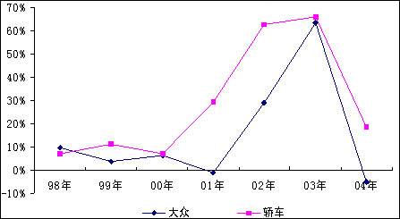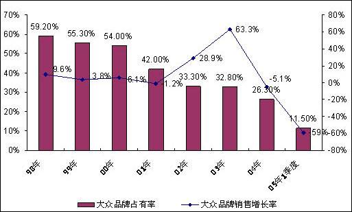 近年大众与轿车市场销售增长率对比 从图中可以看出,在国内轿车市场高速增长的00-04年期间,除2003年大众品牌销售增长与轿车市场整体保持同步外,其余几年大众品牌轿车市场增长速度均低于市场同期水平。尤其是2004年,大众品牌不仅没有保持增长,而且出现负增长,进一步加剧了市场下滑态势。 诚然在一个成熟的汽车市场,任何单一品牌都无法保持市场占有率50%以上,随着竞争对手的加入,大众市场占有率的下降是意料之中的事,但判断大众是否陷入困境则要分析大众品牌自身发展情况——其市场总量是否保持增长。因此,我们得到的结论是:目前大众品牌在中国市场的失败一方面是竞争对手的压力所致,而更重要的是自身出来状况。