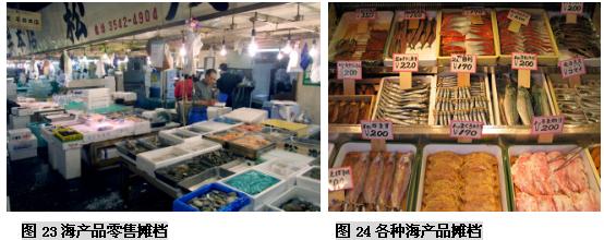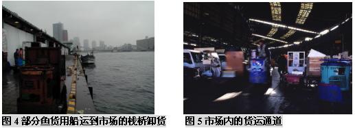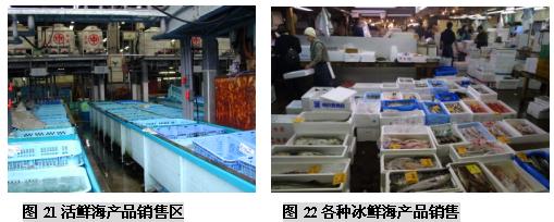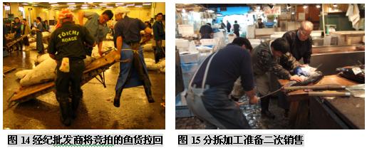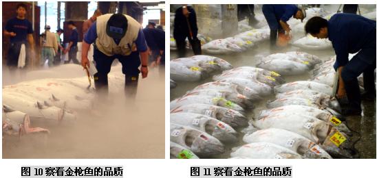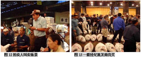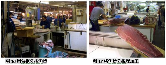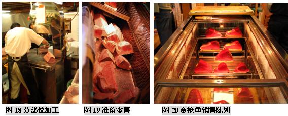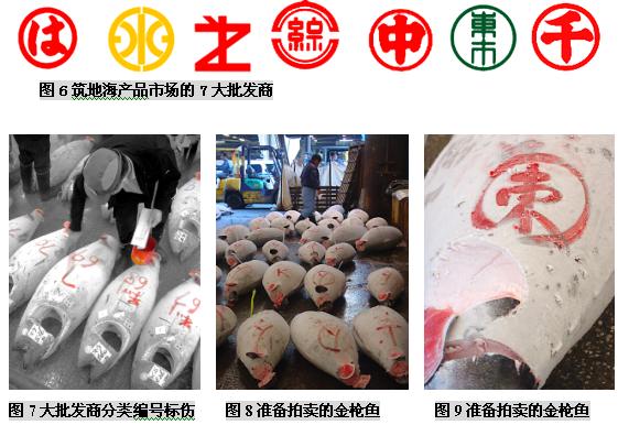 (二)筑地市场的市场功能 东京筑地市场是个约有一英亩大小的巨大市场,它经营着水产物以及蔬菜、肉类等各种各样的新鲜食品,无论是交易量、交易额还是占地面积、交易人数、车辆数量等,都称得上是世界最大规模的。在这被视为日本人“厨房”的筑地市场里,店铺林立而且密集,鱼类是最主要的交易商品,这里集中着世界最高质量的鱼类产品。筑地水产品交易市场每天集中着来自日本全国以及世界各地的约450个品种的2300吨水产品。 筑地市场内有平行的四条主要通道,宽度足够几部单人手推车来回行动,以便采购者将购买的鱼货装箱/桶来到市场外围,然后敷冰再装上小货车运往东京各个地方。与市场四条主要通道垂直的是20条狭窄的步行通道,每个分区有10-20个海产品店铺,它们各自拥有自己的店名、LOGO和经营特色。 东京中央批发市场的功能有以下这些: (三)筑地市场海产品拍卖交易过程 凌晨两点左右,筑地市场开始活跃起来,获准持证交易的大批发商盘点货物,根据等级,重量,新鲜程度等对水产品进行分类。这里的拍卖有铁一般的交易原则:“即日上市,全量销售”,当天到的货必须当天全部拍卖完,以保证渔民的现金收入。 他们用台锯把金枪鱼分割加工,巨大的金枪鱼头、尾和鱼鳍都被切掉,以便于买家察看鱼的肉质。当人们把加工过的金枪鱼放在一起时,鱼体就好像拖网渔船上巨大的拖网浮标一样,而不像是鱼。 大约凌晨4:3O,经纪批发商开始工作,场面显得有些紧张。一般经纪批发商有两种——独立小规模的经纪批发商和代表大公司或大零售商的“市场参与者”。他们在正式交易前要对货物质量进行检查。他们趁深夜打着手电查看了水产品的货色。根据鱼眼睛的透明度、鱼身的光泽、伤痕部位等,他们能知道货物的产地、捕捞方法、捕捞后的保存方法等。筑地市场的经纪批发商都是自1935年市场开设以来的那些买卖行家的后代。他们一眼就能看出货色的高低,并有自己的估价标准,而不靠竞争来决定自己的出价。在筑地市场落标的批发价被称为“标准牌价”,它成为日本全国的市场交易的标准价。筑地市场管理科庶务长大崎秀雄说:“众多经纪批发商都在严峻的经营状况中努力奋斗着,在这里干活的人都是对鱼货有特殊感情的。” 清晨5点左右,随着敲响的钟声,批发商便开始按鱼类品种进行拍卖。拍卖者是在批发行业中拥有拍卖执照的人,在他们的边上围着的是经纪批发商(即市场内的929家店铺的业者),按市场竞争价格进行买卖。经纪批发商从拍卖者那里买进自己需要的数量,然后进行加工零售。为了卖个好价,拍卖者千方百计地营造气氛,例如有时事先预告将会有上等货进来,或是在拍卖时摇晃着身子,或是像念经般地快速唱着品种的号码。外行人根本不懂拍卖人在说些什么,但内行的人会因拍卖人的各种动作和叫卖节奏而兴奋并激起购买欲。筑地市场的拍卖和一般的股票市场交易活动差不多,但叫卖声十分有名,买卖都唱收唱付,高声叫卖,充满了活力。一锤定音的狂热场景更会使人联想到纳斯达克股票市场场景。在叫卖的节奏声中,经纪批发商相继用手指显示买价,直到落标。实际上,一个品种从叫卖、示价到落标的过程非常快,还不到10秒钟。虽然每天的进货量不同,但各种拍卖基本上仅5分钟左右就全部结束了。拍卖之所以能够迅速进行,是由于经纪批发商事先对货物作了了解。 随着太阳冉冉升起,拍卖不断进行,货物一批批成交,一直持续到早上8点。拍卖结束后,经纪批发商将购入的鱼介品搬回市场内各自的店铺或公司。 然后经纪批发商开始剖切加工,以便将鱼货拆零二次销售。如果身在其中,你会发现每个店铺都至少有一个人在组织工作,有人准备冰块,有人像锯木厂锯木头一样,把很大的鱼用大型台锯分割成适于装箱的小块。 在筑地市场还能够看到鲸鱼肉,鲸肉被放在木制分割台上等着切成小块,摊位上挂着可爱的充气鲸鱼模型。 筑地市场有为加工工厂准备了足够大的储存鱼货的冷库,足以储存整个东京10天的海产品储备,要知道东京可是世界上最大城市之一,拥有1000-1200万人口,足够这样的城市10天的储备,可想而知这个冷库有多大。 每天约有2300吨水产品出售,品种极其丰富,金枪鱼、各种海菜、鳗鱼、红啮鱼、海扇、海蜇、柔鱼、梭鱼、章鱼等等,只要海里有的、可以吃的水产,筑地市场都能看到。其中又以金枪鱼的销售规模最大,因为它具有很高的脂肪食量,用来做美味的生鱼片,这是誉满全球的标志性日本特色产品。 早上8点,经过处理的新鲜鱼类便开始出现在店铺货架上。东京地区的超市、鲜鱼店、寿司店和饭馆的采购人员,菜市场和郊区摊贩,家庭主妇等陆续来到筑地市场,每天约有4万多人来这里购买海鲜。经过这些人的精选,美味海鲜最后来到了人们的餐桌上。市场内运货汽车及各种小车往来频繁,卡车以及三轮搬运车的隆隆响声和铺主兴奋的叫卖声交错在一起,非常拥挤,需要随时留意,因为地面非常湿滑,所以在这里的渔工多数穿着胶鞋,高腰水裤和胶皮围裙工作。而在处理水产的地方,海鸥很多,令人大开眼界! 周末东京的早晨,街道上空空荡荡,令人惊异,好像东京人并不太习惯早起。但鱼市的鱼工们却要早晨4点钟起床,每周六天,那些鱼工在极度竞争的环境中紧张地做着生意,驻地市场除了星期天、个别星期三和法定假期外,市