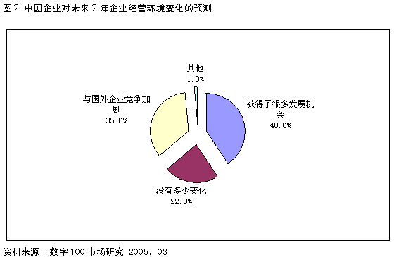 如果说中国加入WTO的三年,中国企业机遇与挑战并存的话,那么未来2年,中国企业将面临的竞争压力骤增,但仍存在较大的发展机遇。 在谈到对未来两年中国企业经营环境的预测时,接近36%的企业表示“与国外企业竞争加剧”,与过去三年同比增长了12个百分点,这不仅说明中国企业面临的竞争会进一步加剧,同时也表明中国企业对未来的经营环境有了更加清醒的认识;在预测未来竞争环境更加恶劣的同时,4成略强的企业同时也表明“未来两年将获得更多的发展机会”。