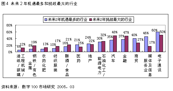 接受访问的企业普遍认为“电子通讯行业”即是未来2年机遇最多的行业,同时也是未来2年挑战最大的行业,一方面,电子通讯行业由于新技术新产品不断推陈出新,产品升级换代不断加速,消费者消费能力的提高,和巨大的市场潜力,企业的面临的市场机会将不断增加,但同时中国企业能否在行业技术标准和关键技术核心方面有所突破,这将是决定中国电子通讯行业企业未来命运的关键所在。