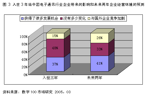 二、中国本土电信企业仍有望在国内市场上占据绝对优势 从世界范围内来看,电信行业仍是最具有投资价值的行业之一,《财富》杂志在2004年10月公布了按照收入排名的世界500强企业的名单,这些企业分布在大大小小50个行业,电信行业无论是在收入、利润、利润率等指标都比较靠前,其中收入总额居第4位,收入利润率仅次于银行业而位居第2位,数值达到了8.06%,这样的行业收入利润率对全球的资本来说,构成了很大的吸引力,电信行业仍是最具有投资价值的行业之一。 从全球的电信市场来看,发展中国家未来市场增长潜力巨大,2001年以来,亚太是唯一一个全球电话用户数市场份额持续大幅增长的地区,目前该地区固定和移动用户总数占了全球39%的份额,成为世界上最大的电信市场。该地区每秒钟就会新增一名以上用户,近两年来,当世界其他地区遭受电信低迷之际,几项最快的增长指标都出现在亚太地区。 亚太地区最大的电信市场中国,如果以用户数量计算的话,中国目前已经取代美国成为世界上最大的电信市场。与庞大用户基数对应的是电信运营商漂亮的业绩,2002年中国移动和中国电信的营业收入分别达到207.7亿美元和194.7亿美元,利润分别为35.8亿美元和17.亿美元;利润率分别是17%和9%,均高于8.06%的世界平均水平。 中国电信行业企业巨额的基础设施投资、庞大的用户基础、相关行政政策许可为外资电信行业的进入设置了一个比较高的门槛,加上目前电信运营商(无论是固话、移动、网络)的数量非常有限,国内竞争环境相对并不激烈。 不可否认的是目前中国电信运营商无论在规模、技术、资金等方面和国际巨头存在很大的差异,但由于电信行业的特殊性,中国本土电信在国内市场仍将占有绝对优势。 三、电子通讯业在未来两年内是一个高机遇高风险的行业 无论在中国还是在世界范围,目前的电子业都仍是朝阳产业,对于电子通讯业,近期内国家尚无相应政策变动。中国电子通讯业看来已经在与狼共舞的过程中,适应了规则,练就了功力,虽然过去三年感受到了一定的竞争压力,但总体来说,过去三年国内电子通讯企业更多的是获得了发展机会;就未来两年国内电子通讯企业对经营环境的预测来看,在机遇增加的同时,面临的竞争压力和挑战会更大。