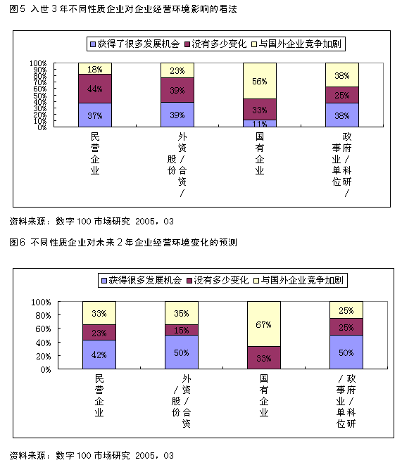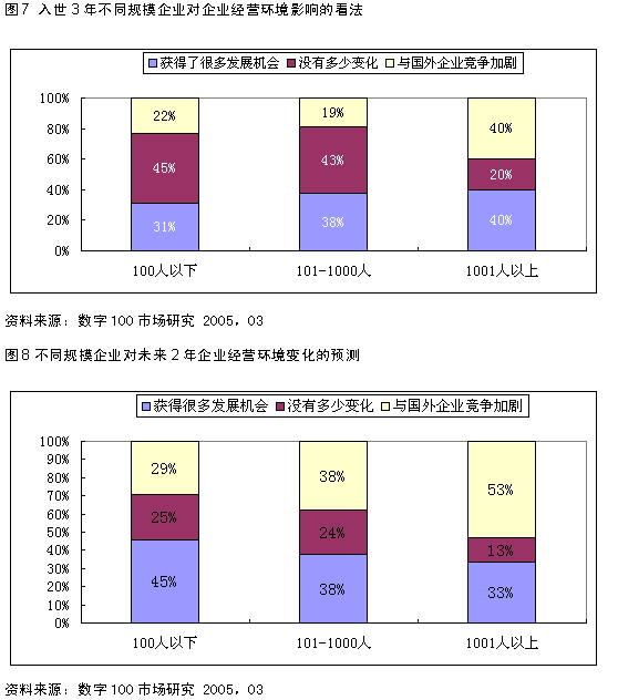对比入世对于不同规模的企业产生的影响,从现有的调查看,WTO对“大型企业”的影响要远高于对“中小型企业”的影响。对大型企业的影响可以概括为“机会与竞争并存”,而对中小企业来讲,中国加入WTO,更多的是“获得了发展的机会”。