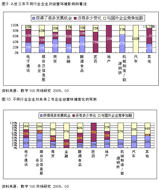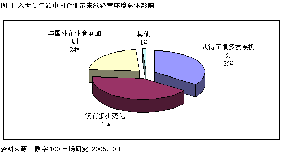 中国加入WTO已经三年了,三年的WTO之旅,究竟给中国不同行业企业带来了什么样的影响?随着相关行业开放时间表的日益临近,这些行业的企业将会面临什么样的挑战和机遇? 北京数字100市场研究有限公司发起了“经理人展望未来”专题调查,此次调查共回收有效问卷110份,问题涉及范围不仅包括WTO背景下我国大型国企、中小企业的生存状态,而且还透过来自国际、国内行业精英、知名企业领袖以及业界成功职业经理人对于“WTO给中国企业带来的机遇和挑战”的看法,分析和预测中国加入WTO给中国汽车、地产、媒体信息业、商贸以及制造、食品等快速消费品等诸多行业带来的机遇和挑战,以及这些行业可能出现的新变化。 一、中国入世三年之旅,中国企业挑战与机遇并存;未来两年,中国企业竞争压力骤增,但仍存较大发展机遇 中国加入WTO三年来,中国经济越来越融入世界经济圈的范畴,使得更多的中国企业可以走出国门,拥抱全球市场,约1/3接受访问的中国企业表示“加入WTO以后企业获得了更多的发展机会”;加入WTO以后,在中国企业走向世界的同时,许多外资企业也纷纷涌进中国,与中国同行业企业之间形成激烈的竞争,约1/4接受访问的中国企业明显表示“感受到与国外企业竞争加剧”。