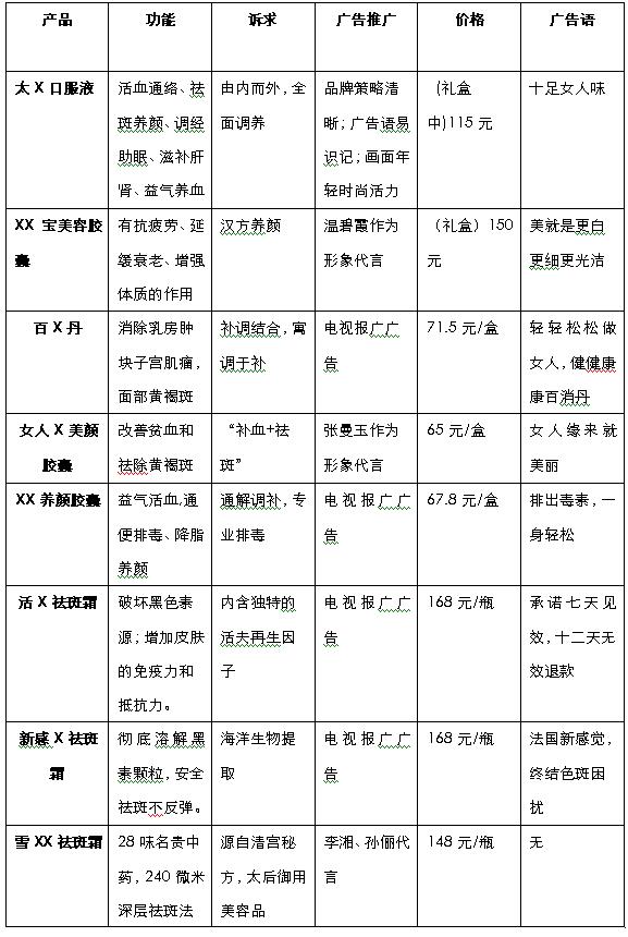 序: “正本清源,无限精彩”是高度营销咨询机构给新科奇生物公司的保姿祛斑胶囊做的营销传播标语。此语一出,客户便表现出极大的兴趣;等我演示完整个提案后,全场一致通过!保姿上市后,品牌广告语“保姿30天,做不一斑女人”也立即成为一道记忆亮点并伴随保姿风靡各大商场药店。功夫不负有心人,令我们感到十分欣慰。作为专案小组的负责人,我把我们组近两个月的调查思考等工作全程纪录了下来,一是因为自己习惯在每次提案之后要给一个总结;二来可作抛砖引玉之用。 一、揭开中国祛斑市场神秘面纱——行业盘点 由于亚洲女性与欧美女性皮肤的结构截然不同,欧美女性随着年龄的增长需要解决的最大问题是除皱,而亚洲人的最大问题就是肌肤色素容易积聚沉着并形成色斑。现代科学研究证实,约有98%的中国女性存在不同程度的色斑,因此拥有巨大产品市场空间。 面对这块越做越大的蛋糕,抵挡不住诱惑的勇者仍然是前仆后继…… 竞争激烈,十面埋伏—— 黄褐斑在30-50岁的女性中是个普遍的现象,消费者最急切的美容需求即是祛斑。脸上只要有斑的女性一般都会去购买祛斑产品。在25-50岁的这个年龄范围没有人对黄褐斑不进行处理的。而消费者对真正有效的祛斑产品求之若渴,也使得这个市场永远都炙手可热。 从一系列的调查分析中,我们得出结论: 二、祛斑市场上,演的是哪一出? 透过这些竞品,我们看到了祛斑产品内服和外用这两种明显的区划。 然而,现实却不给祛斑心切的消费者一点点安慰! 外用祛斑——褪之不去,祛之不尽 启示: 三、消费者:知我者谓我心忧,不知我者谓我何求? 对这些原因的认知,使得她们由简单使用外用护肤品逐步过渡到“内服外护”、“以内养外”的密切结合,由单一营养补充转向综合调理为主;这也表明了消费者美容保健意识日趋成熟。 通过调查我们还了解到,随着月美容消费水平逐渐提高,带来更强劲的购买力;价格不再是影响购买的首要因素,品牌、功效和口碑是消费者考虑购买的综合因素;28-45岁的城市女性,呈理性化消费,易接受和信赖传统中医的以内养外理论。 三、保姿:刀锋入世,巧打三张牌 第一张:诚信教育,产品说服。 如何找到一个既能迎合消费者“祛斑”若渴的心理,又能诚实地反应产品功效的产品概念,是所有产品成功入市的关键。为化解这个难题,我们两面出击:消费者心理研究和产品祛斑机理挖掘。 从表上我们可以看到,随着女性的角色从单身到空巢的变化,女性“自我”骤然下降。女人从走出婚礼殿堂的那一刻起,就踏上一条失去自我的不归路。感怀天下女人,无私奉献着自己!从图表上我们还得到一个重要启发:生育后的女性兼有母亲、妻子、儿媳多重角色,自我却所剩无几,是女性一生中负重最大的时期。尤其是产后女性,身心疲惫,几乎全部被掏空,连容貌也被改变,脸上长满了斑点,夫妻生活也开始不协调,处于人生链条中最薄弱的一环,是最需要综合保养的人群。产后女性的生理心理变化,使她们迫切需要--重拾自我,让自己不一般!于是我们决定产后女性入手,撕开市场。 卵巢是女性“青春引擎”,具有分泌雌激素、孕激素的功能,是女性分泌雌激素的唯一器官,雌激素是女性“年青动力”,卵巢功能先天不良或退化导致产后斑点增多的根本原因。要想根本祛斑,必须根本调养好卵巢和内部机理。 产品USP:根本养阴祛斑法