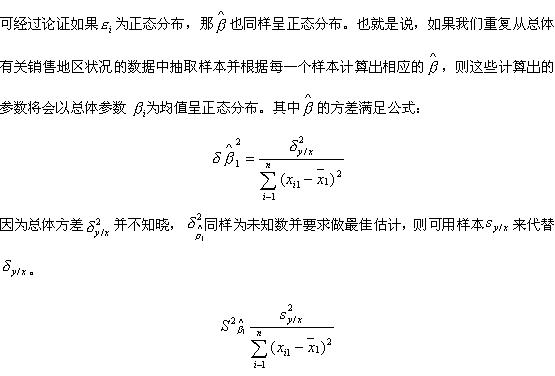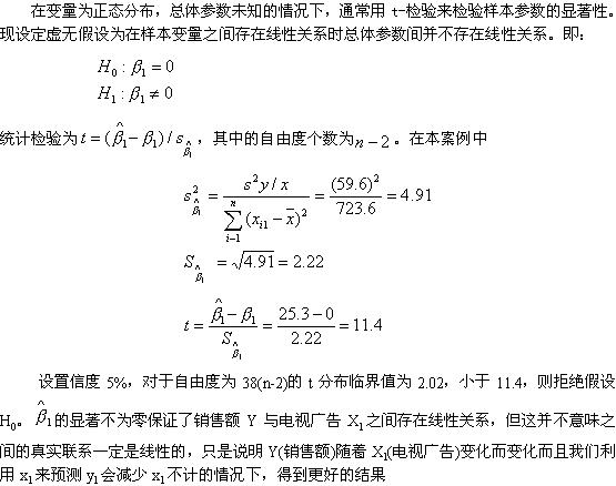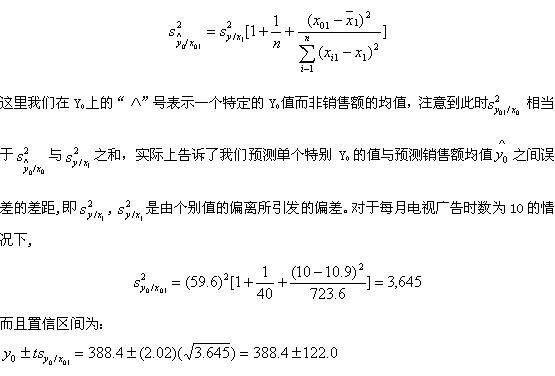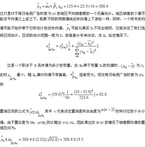 (二)回归分析(3) 有关斜率系数的分析 前面计算有关斜率系数 值为25.3,但我们并不知道这个结果是否源于偶然性,是否具有意义,这就需要对其进显著性检验,根据著名的Gauss-Markov理论,如果我们要对回归系数进行统计检验我们要假设该变量的离差为随机分布,这与前面我们所提到的矩状型分布是有所出处的, 此外,我们还需要设定由最小二乘法所估计出的总体参数是符合有效,无偏,最大拟然估计原则的估计值。 如果H0不能被拒绝,情况又会怎么样呢?正如我们所指出的, 代表样本回归直线的斜率,为 变动一单位Y所相应变化的数额,如果不能证明 =0的虚无假设不存在,这也不能完全否定Y与X1之间没有联系,可能是我们在检验中犯了第二类错误,没有拒绝不成立的假设。另外一种可能就是Y与X之间的关联是以某种曲线型方式存在,而我们运用了错误的模式去推算。 对Y值的预测 如果所求出的回归方程并非为偶然联系,那么我们就可以利用它来对给定的电视广告时下的销售额进行预测,需要考虑两种情况: 1.预测给定 情况下的Y的平均值。 2.预测给定 情况下的Y的一个单值。 让我们依次来讨论这两种情况。 给定的 的值记为 ,由回归方程得出的Y值即为所求的平均值,记为 则对于一个每月电视广告时数为10的地区,预计平均销售 为: 以上告诉我们的是如何计算当电视广告时数每月为10时整个地区的平均销售额水平,但有时候我们希望能对某些特别的地区的销售进行预测。这样预测中包含了一个附加的误差项,其数值等于一个特别值可能造成的偏差。因此预测单个销售能所存在的错误率要比预测整个销售额平均水平时的大。相应地,它所满足的公式为: 读者可比较一下两种预测情况下的置信区间的范围,即两者偏差的大小。 |