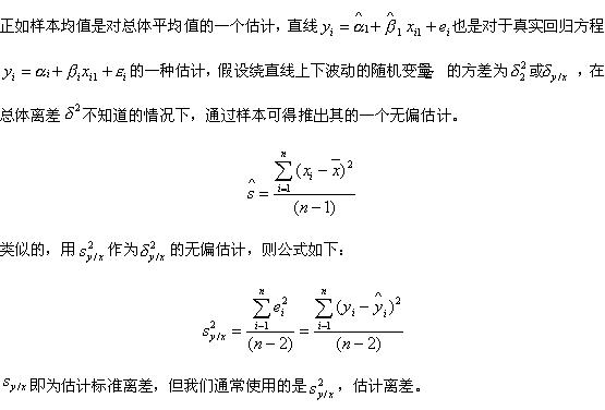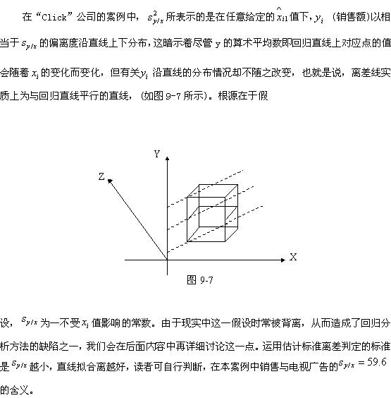 (二)回归分析(2) 估计标准差 对图9-7的仔细检查发现,尽管直线拟合数据拟合得很好,但仍存在若干点对于直线的偏离,从而实际上这些偏差的大小代表了回归方程直线拟合的优劣,成为判断方程好坏的一个指标。同样我们可以利用统计中的有关知识计算出这个指标。