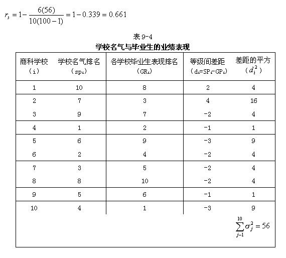 一、相关分析(3) 3.等级相关(RankConelation) 有些时候,对现象或事物无法以精密数量确定其大小,轻重,只能以等级或次序排列出。例如,才智高低,事态轻重,色泽深浅,效率大小以及味道的好坏等,一般只能以等级排列。即使是精密的数据,有时也采用等级来测定它们之间的相互关系,这种关系一般是以等级相关系数来表示的,而在这些等级相关系数中,以司庇而曼(C.Spearman)的等级相关运用最为普遍。其公式为: 其中:d=各对数据的等级差异 n=样本的数据总数 司庇而曼相关系数是针对于两个序数变量的,其中每个变量的数据已按一定标准划分成1至n个等级,如果 的和为0,那么rs=1。也就是说此时两个变量的等级是等价的。rs值由+1(完全正相关)变化到-1(完全负相关),其中若rs=0意味着彼此不相关。 现有一个案例:在过去的几年间一家工业品营销公司一直从其总部附近地区的10所商科学校毕业生中招募销售人员,现在想确定这十所学校的相对名气与它的毕业生表现业绩之间是否存在关联。该公司的销售经理自己对这10所学校的声誉以及各自毕业生在本公司的表现进行了分级,这些等级评定情况见表9-4的第二列以及第三列。现在问题是各学校的名气与来自于各学校学生的销售业绩之间究竟有多大的联系呢? 借助于司庇而曼相关等级系数公式,我们可知: rs的值为0.661表明两个等级排名之间至少存在一定的联系,那么这种联系在统计上显著吗?回答这个问题我们可以假定这10所学校是以商科学校总体中抽出的随机样本调查,然后检验以下检验: H0:PS=0 H1:PS≠0 PS为两个等级集总体相关等级系数,当n≥10时,以下的检验数据将是满足自由度为n-2的t-值分布: 因为t>2.31,所以我们拒绝H0并认为各商科学校的名气与其毕业生的工作表现存在真实的相关性。换而言之,样本中0.661的相关性不大可能由于偶然性而导致的。 值得一提的是我们是根据不同等级对之间的等级差距来计算rs的,这种作法与认为构成序数尺度的数字之间的差距是没有什么意义的观点不同,事实上,在计算rs时我们已假设两个变量同等级的差距是具有可比意义的,如果这个假设前提不成立,那么司庇而曼等级相关系数也就没什么意义了。 |
