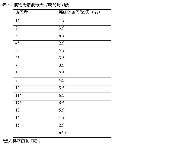 本质上,fpc依赖于n与N的关系,如果总体容量N非常大而样本容量n较小,那么fpc将接近1;另一方面,如果样本容量n接近总体容量N,那么fpc将小于1且将减小估计的总体方差的数值。在大多数消费者商品研究中,无限目标总体的假设是合理的——目标总体通常包括数以百万的个人或家庭。 在以一定精确水平估计总体参数时经常需要决定样本容量。决定样本容量的程序是 ①规定可接受的容许水平(h)。这是估计值与它的未知的实际总体值的差别。规定可接受容许水平的一种方法是取所需置信区间的一半。 ②决定可靠性系数(Z1-Z2),这个系数取决于所需确定性水平(1-a/2)。 ③取得在目标总体中测量的特征的标准差( )的估计值。这个估计值可以基于以前的研究,小规模的试验性研究,或主观猜测,或者取特征值估计的分布范围的六分之一(如果正态)。 ④应用下列公式求得所需样本容量n* 为了保证在预期平均值固定百分比范围内的估计值,应按照下列程序: ①规定可接受的相对容许水平(N),这个值表示为一个固定百分比(例如5%或10%)。 ②决定可靠性系数(Z1-a/2)。 ③取得在目标总体中测量的特征的变异系数的估计值。变异系数是对相对离散的测量,以给出,这里是总体平均值的实际标准差,是(实际的)总体平均值。为了决定所需样本容量的目的,获取在目标总体中的特征的预期平均值的估计值( )和该特征的估计的标准差( ),计算估计的变异系数 例 假设你作为一名初级分析员的职责的一部分是监督实现作业。特别的,你负有责任估计所有为你的部门执行购物街拦截调查的实地工作人员每天完成访问的平均数。为了决定样本中应包括多少实地访问,你抽取一个简单随机样本以获取每天完成访问数目的平均值和方差的样本估计值。表6-1列出了十五名实地访问人员每天完成访问的数目。  |