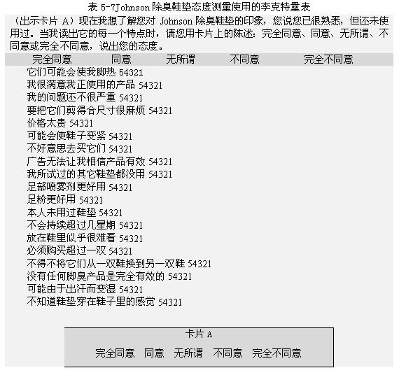 沙氏通量表构作比较麻烦但使用操作很简单,只要求受测者指出量表中他同意的陈述或语句。每条语句根据其类别都有一个分值,量表中的语句排列可以是随意的,但每个受测者都应该只同意其中的分值相邻的几个意见,如果在实际中一个受测者的语句或意见其分值过于分散,则判定此人对要测量的问题没有一个明确一致的态度,或者量表的构作可能存在问题。 沙氏通量表根据受测者所同意的陈述或意见的分值,通过分值平均数的计算求得受测者的态度分数。例如某人同意第八个意见,他们态度分数就是8,如果同意七、八、九三条意见,他们态度分数为(7+8+9)/3=8。在上例中,分数越高,说明受测都对某一问题持有的态度越有利;分数越低,说明持有的态度越不利。沙氏通量表是顺序量表,可以用两个受测者的态度分数比较他们对某一问题所持态度的相对有利和不利的情况,但不能测量其态度的差异大小。 沙氏通量表在市场营销研究中使用得不是太多,主要原因是沙氏通量表的构作非常麻烦,即使单一主题的量表构作也要耗费大量的时间,对于多个主题的沙氏通量表制作就更加困难。另外,不同的人即使态度完全不同,也有可能获得相同的分数。例如一个人同意第5个意见,得5分,另一个人同意第3、4、8条意见,也得5分。再有,沙氏通量表无法获得受测者对各条语句同意或不同意程度的信息,这也是其缺点之一。 5.李克特量表 李克特量表形式上与沙氏通量表相似,都要求受测者对一组与测量主题有关陈述语句发表自已的看法。它们的区别是,沙氏通量表只要求受测者选出他所同意的陈述语句,而李克特量表要求受测者对每一个与态度有关的陈述语句表明他同意或不同意的程度。另外,沙氏通量表中的一组有关态度的语句按有利和不利的程度都有一个确定的分值,而李克特量表仅仅需要对态度语句划分是有利还是不利,以便事后进行数据处理。李克特量表构作的基本步骤如下: (1)收集大量(50~100)与测量的概念相关的陈述语句。 (2)有研究人员根据测量的概念将每个测量的项目划分为“有利”或“不利”两类,一般测量的项目中有利的或不利的项目都应有一定的数量。 (3)选择部分受测者对全部项目进行预先测试,要求受测者指出每个项目是有利的或不利的,并在下面的方向-强度描述语中进行选择,一般采用所谓“五点”量表: a.非常同意b.同意c.无所谓(不确定)d.不同意e.非常不同意 (4)对每个回答给一个分数,如从非常同意到非常不同意的有利项目分别为1、2、3、4、5分,对不利项目的分数就为5、4、3、2、1。 (5)根据受测者的各个项目的分数计算代数和,得到个人态度总得分,并依据总分多少将受测者划分为高分组和低分组。 (6)选出若干条在高分组和低分组之间有较大区分能力的项目,构成一个李克特量表。如可以计算每个项目在高分组和低分组中的平均得分,选择那些在高分组平均得分较高并且在低分组平均得分较低的项目。 李克特量表的构作比较简单而且易于操作,因此在市场营销研究实务中应用非常广泛。在实地调查时,研究者通常给受测者一个“回答范围”卡,请他从中挑选一个答案。需要指出的是,目前在商业调查中很少按照上面给出的步骤来制作李克特量表,通常由客户项目经理和研究人员共同研究确定。表5-7是用于那些已经在一个过滤型问卷中承认自己有脚臭问题,但还没有试用果Johnson牌除臭鞋垫的人们进行调查时使用的李克特量表 。