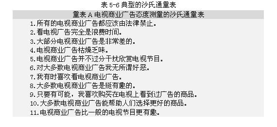 (二)测量的基本技术(续) 4.沙氏通量表 在市场营销研究中,经常涉及到对某一主题的态度测量,如人们对于电视商业广告的态度、对人寿保险的态度等。沙氏通量表通过应答者在若干(一般9—15条)与态度相关的语句中选择是否同意的方式,获得应答者关于主题的看法。沙氏通量表的实地测试和统计汇总都很简单,只是量表的构做相对来说比较麻烦。一个测量态度的沙氏通量表,其构做的基本步骤如下: (1)收集大量的与要测量的态度有关的语句,一般应在100条以上,保证其中对主题不利的、中立的和有利的语句都占有足够的比例,并将其分别写在特制的卡片上。 (2)选定二十人以上的评定者,按照各条语句所表明的态度有利或不利的程度,将其分别归入十一类。第一类代表最不利的态度,依次递推,…,第六类代表中立的态度,…,第十一类代表最有利的态度。 (3)计算每条语句被归在这十一类中次数分布。 (4)删除那些次数分配过于分散的语句。 (5)计算各保留语句的中位数,并将其按中位数进行归类,如果中位数是n,则该态度语句归到第n类。 (6)从每个类别中选出一、二条代表语句(各评定者对其分类的判断最为一致的),将这些语句混合排列,即得到所谓的沙氏通量表。 下面的表5-6给出了一个典型的沙氏通量表所包含的十一条态度语句。沙氏通量表通常在设计时,将有关态度语句划分为十一类,其实并不一定非要划分成十一类不可,多些少些都可以,但最好划分成奇数个类别,以中点作为中间立场。分类后在每个类别中至少选择一条代表语句,也可以选择多于一条语句,这样组成的沙氏通量表就不止包含与类别数相同的语句,可能多达二十几条态度语句,但一般来讲在每个类别中选择多条语句没有特别的必要。