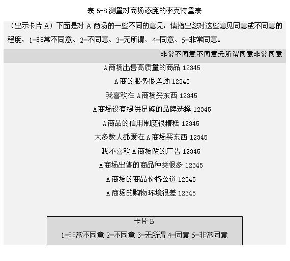 在李克特量表中,受访者要对每一条语句分别表示同意的程度。一般采用5级:非常同意、同意、无所谓、不同意和非常不同意,当然也可以是相反的顺序,如1表示非常不同意,5代表非常同意等。可以将各数字代表的含义在题目开头给出,然后让受访者根据对每个陈述语句同意程度填写1~5中的某个数字,但更常用的一种格式是将1~5分别列在每个陈述语句的后面,让受访者根据自己同意或不同意的程度在相应的数字上打钩或划圈。后一种方式看起来不太简洁,但更便于受访者理解和回答。下面的表5-8是一个利用李克特量表测量人们对某商场态度的例子。