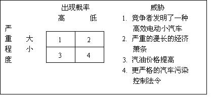 图2 机会矩阵 图2表示一个机会矩阵和某汽车公司所面临的若干机会分布情况。公司在每一个特定机会中的成功概率取决于它的业务实力(即独特的能力)是否与该行业成功所需要的条件相符合。经营最佳的公司将是那些在满足该行业成功条件中拥有大量竞争优势的企业,这些优势形成公司为顾客创造-价值的能力。 (二)环境威胁分析 环境威胁是指环境中一种不利的发展趋势所形成的挑战,如果不采取果断的营销行动,这种不利趋势将导致公司市场地位被侵蚀。