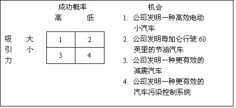 图3 威胁矩阵 公司营销经理应该在其营销计划中把公司所面临的威胁识别出来。这些威胁应按其严重性和出现的可能性分类。左上角的威胁是关键性的,因为它们会严重地危害公司利益,并且出现的可能性也最大。公司需要为每一个这样的威胁准备一个应变计划,这些计划将预先阐明在威胁出现之前或者当威胁出现时,公司将进行哪些改变。 把某个特定公司所面临的威胁和机会集中图解出来,旧能勾勒出整个情况的特征。有四种可能的结果。一种理想的业务是指拥有很多大好机会,而很少甚至可以避免威胁。一种投机性的业务是大好机会和威胁的出现率同样高。一种成熟的业务是大好的机会和威胁都很少。最后,一种麻烦的业务是机会很少,威胁却很大。 |