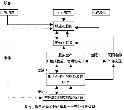 (三)服务质量管理 1、服务质量差距的管理 经过长期营销实践,美国服务问题专家建立了一个差距分析模型,专门用来分析质量问题的根源。 服务质量差距模型见图8-1: 首先,模型说明了服务质量是如何形成的。模型的上半部涉及与顾客有关的现象。期望的服务是顾客的实际经历、个人需求以及口碑沟通的函数。另外,也受到企业营销沟通活动的影响。 实际经历的服务,在模型中称为感知的服务,它是一系列内部决策和内部活动的结果。在服务交易发生时,管理者对顾客期望的认识,对确定组织所遵循的服务质量标准起到指导作用。 当然,顾客亲身经历的服务交易和生产过程是作为一个与服务生产过程有关的质量因素,生产过程实施的技术措施是一个与服务生产的产出有关的质量因素。 分析和设计服务质量时,这个基本框架说明了必须考虑哪些步骤,然后查出问题的根源。要素之间有五种差异,也就是所谓的质量差距。质量差距是由质量管理前后不一致造成的。最主要的差距是期望服务和感知(实际经历)服务差距(差距5),五个差距以及它们造成的结果和产生的原因分述如下: (1)管理者认识的差距(差距1) 这个差距指管理者对期望质量的感觉不明确。产生的原因有: A、对市场研究和需求分析的信息不准确; B、对期望的解释信息不准确; C、没有需求分析; D、从企业与顾客联系的层次向管理者传递的信息失真或丧失; E、臃肿的组织层次阻碍或改变了在顾客联系中所产生的信息。 治疗措施各不相同。如果问题是由管理引起,显然不是改变管理,就是改变对服务竞争特点的 认识。不过后者一般更合适一些。因为正常情况下没有竞争也就不会产生什么问题,但管理者一旦缺乏对服务竞争本质和需求的理解,则会导致严重的后果。 (2)质量标准差距(差距2) 这一差距指服务质量标准与管理者对质量期望的认识不一致。原因如下: A、计划失误或计划过程不够充分; B、计划管理混乱; C、组织无明确目标; D、服务质量的计划得不到最高管理层的支持。 第一个差距的大小决定计划的成功与否。但是,即使在顾客期望的信息充分和正确的情况下,质量标准的实施计划也会失败。出现这种情况的原因是,最高管理层没有保证服务质量的实现。质量没有被赋予最高优先权。治疗的措施自然是改变优先权的排列。今天,在服务竞争中,顾客感知的服务质量是成功的关键因素,因此在管理清单上把质量排在前列是非常必要的。 总之,服务生产者和管理者对服务质量达成共识,缩小质量标准差距,远要比任何严格的目标和计划过程重要得多。 (3)服务交易差距(差距3) 这一差距指在服务生产和交易过程中员工的行为不符合质量标准,它是因为: A、标准太复杂或太苛刻; B、员工对标准有不同意见,例如一流服务质量可以有不同的行为; C、标准与现有的企业文化发生冲突; D、服务生产管理混乱; E、内部营销不充分或根本不开展内部营销; F、技术和系统没有按照标准为工作提供便利。 可能出现的问题是多种多样的,通常引起服务交易差距的原因是错综复杂的,很少只有一个原因在单独起作用,因此治疗措施不是那么简单。差距原因粗略分为三类:管理和监督;职员对标准规则的认识和对顾客需要的认识;缺少生产系统和技术的支持。 (4)营销沟通的差距(差距4) 这一差距指营销沟通行为所做出的承诺与实际提供的服务不一致。产生的原因是: A、营销沟通计划与服务生产没统一; B、传统的市场营销和服务生产之间缺乏协作; C、营销沟通活动提出一些标准,但组织却不能按照这些标准完成工作; D、有故意夸大其辞,承诺太多的倾向。 引起这一差距的原因可分为两类: 一是外部营销沟通的计划与执行没有和服务生产统一起来; 二是在广告等营销沟通过程中往往存在承诺过多的倾向。 在第一种情况下,治疗措施是建立一种使外部营销沟通活动的计划和执行与服务生产统一起来的制度。例如,至少每个重大活动应该与服务生产行为协调起来,达到两个目标: 第一,市场沟通中的承诺要更加准确和符合实际; 第二,外部营销活动中做出的承诺能够做到言出必行,避免夸夸其谈所产生的副作用。在第二种情况下,由于营销沟通存在滥用“最高级的毛病”,所以只能通过完善营销沟通的计划加以解决。治疗措施可能是更加完善的计划程序,不过管理上严密监督也很有帮助。 (5)感知服务质量差距(差距5) 这一差距指感知或经历的服务与期望的服务不一样,它会导致以下后果: A、消极的质量评价(劣质)和质量问题; B、口碑不佳; C、对公司形象的消极影响; D、丧失业务。 第五个差距也有可能产生积极的结果,它可能导致相符的质量或过高的质量。感知服务差距产生的原因可能是本部分讨论的众多原因中的一个或者是它们的组合。当然,也有可能是其他未被提到的因素。 差距分析模型指导管理者发现引发质量问题的根源,并寻找适当的消除差距的措施。差距分析是一种直接有效的工具,它可以发现服务提供者与顾客对服务观念存在的差异。明确这些差距是制定战略、战术以及保证期望质量和现实质量一致的理论基础。这会使顾客给予质量积极评价,提高顾客满意程度。 2、影响服务质量的因素分析 质量的四个来源,即设计、生产、交易与顾客的关系——这些方面的管理方法也影响着顾客感知的质量。服务的技