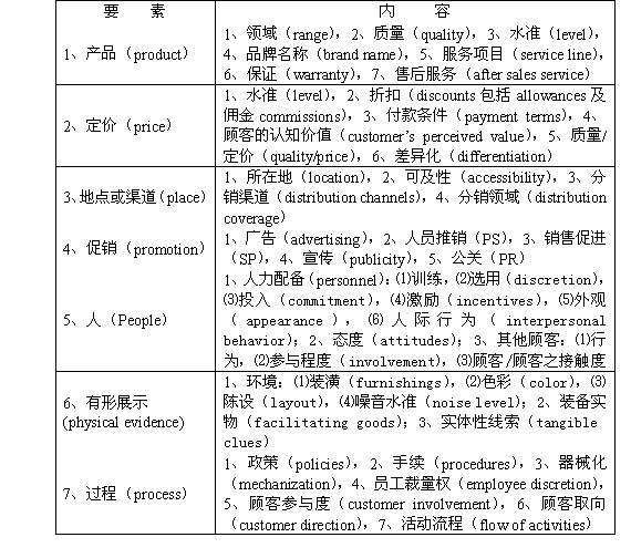 (三)服务营销组合 1、服务营销组合的七要素 服务营销组合是服务企业依据其营销战略对营销过程中的七个要素变量进行配置和系统化管理的活动。 营销组合是为了便利管理者控制所有的变数条件并使之系统化,因为这些变数会影响到市场交易。服务市场营销组合的形成过程,大致与其他型态的市场相似。其过程主要是:(1)将产品分解成部份或细节组合;(2)将各细节组合调整成为营销组合。 每一公司所采用的独特营销组合应随条件(如需求水平、服务提供的时代)的变化而变化,营销组合过程也是随着变动的市场状况和需求不断修正和调整其构成要素的。不可避免地,营销组合的各种不同成分之间,会有所重复且相互关联。因为在做决策时,考虑组合中的一项内容,不可能不考虑到它对其他组合项目的牵制和影响。见表5-3: (1)产品 服务产品所必须考虑的是提供服务的范围、服务质量和服务水准,同时还应注意的事项有品牌、保证以及售后服务等。服务产品中,这些要素的组合变化相当大,这种变化可以从一家供应数样菜色的小餐馆和一家供应各色大餐的五星级大饭店相比较之后看出来。 (2)定价 价格方面要考虑的因素包括:价格水平、折扣、折让和佣金、付款方式和信用。在区别一项服务和另一项服务时,价格是一种识别方式,因此顾客可从一项服务获得价值观。而价格与质量间的相互关系,在许多服务价格的细部组合中,是重要的考虑对象。 (3)渠道 提供服务者的所在地以及其地缘的可达性在服务营销上都是重要因素,地缘的可达性不仅是指实物上的,还包括传导和接触的其他方式。所以销售渠道的形式以及其涵盖的地区范围都与服务可达性的问题有密切关系。 表5-3 服务业的营销组合(7P’s) (4)促销 促销包括广告、人员推销、销售促进或其他宣传形式的各种市场沟通方式,如公关。 以上四项是传统“组合”要素;但服务营销人员则显然有必要增添更多的要素,如人、有形展示和过程。 (5)人 在服务业公司担任生产或操作性角色的人(如在银行做行员或在餐馆做厨子),在顾客眼中其实就是服务产品的一部分,其贡献也和其他销售人员相同。大多数服务公司的特色是操作人员可能担任服务表现和服务销售的双重任务。换言之,在服务业公司的服务执行者工作得如何,就象一般销售活动中销售能力如何一样重要。 此外,对某些服务业而言,顾客与顾客间的关系也应重视。因为,一位顾客对一项服务产品质量的认知,很可能是受到其他顾客的影响。例如某个旅行团中的特殊成份结构,或者一家餐厅的其他食客的行为都可能影响顾客所得到的服务产品,在这种情况下,管理者应面对的问题,是在顾客与顾客间相互影响方面的质量控制。 (6)有形展示 在市场交易上没有有形展示的“纯服务业”极少,因此有形展示的部分会影响消费者和客户对于一家服务营销公司的评价。有形展示包括的要素有:实体环境(装潢、颜色、陈设、声音)以及服务提供时所需用的装备实物(比如汽车租赁公司所需要的汽车),还有其他的实体性线索,如航空公司所使用的标示或干洗店将洗好衣物加上的“包装”。 (7)过程 人的行为在服务业公司很重要,而过程也同样重要,即服务递送过程。表情愉悦、专注和关切的工作人员,可以减轻顾客必须排列等待服务的不耐烦的感觉,或者平息技术上出问题时的怨言或不满。当然工作人员的良好态度,对这引起问题是不可能全部补救的。整个体系的运作政策和程序方法的采用、服务供应中器械化程度、雇用人员裁量权用在什么情况、顾客参与服务操作过程的程度、咨询与服务的流动、订约与待候制度等都是经营管理者要特别关注的事情。 在许多服务经营上表现、人和过程是密不可分的。营销管理者必须重视服务表现和递送的过程顺序,在营销组合中这个重要也应包括。对于从事服务业营销活动的公司机构,这方面也是相当重要的。将生产或操作角色分开的传统作风,现在可能已经不合适了。从事服务业经营的管理者们,通常都扮演综合性的经营角色,即人事、生产、营销和财务等功能可说是无所不包。 2、服务营销组合的特殊性 服务营销组合较之产品营销组合的特殊性首先表现为服务营销组合包括七项要素而不是四项要素。产品、定价、渠道、促销四要素的传统式组合结构是适用于有形产品营销的营销策略,这样的组合结构已不为服务业实用了,而必须采用新的营销组合要素及结构,这是由以下原因决定的: (1)4Ps的营销组合,是根据制造业的情况确定的。由于服务业产品的非实体性特征,决定了适宜于实物产品的营销组合并不能适应服务业的需要。 (2)服务业的营销实务从事者认为营销组合内容不足以涵盖服务业的需要。在实践中服务业管理者发现,若与制造业公司相比,他们必须要应付一些显然不同性质的问题。 (3)越来越多的证据显示,营销组合的层面和范围,不适应于服务业管理,足够的证据足以说明有必要重新制定营销组合以适应服务营销,例如,以现有的结构和背景,提供或从事服务的人并没有想到现有布局、气氛和陈列方式的问题,但这些问题可能对于某些服务的购买、具有重要影响。事实上有一系列的要素(如人员、有形展示和过程)是传统营销组合框架所未能涵盖的。 服务营销组合的特殊性还表现为服务营销组合是一种艺术也是一种