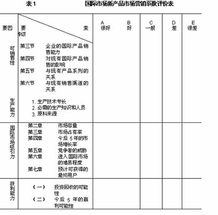 (三)国际市场新产品开发 1.新产品的涵义及其分类 市场营销意义上的新产品是一个广义的新产品概念,它具体可以包括新发明产品,改进的产品,改型的产品和新的品牌。新产品除包含因科学技术在某一领域的重大发现所产生的新产品外,还包括如下方面:在生产销售方面,只要产品在功能或形态上发生改变,与原来的产品产生差异,甚至只是产品单纯由原有市场进入新的市场,都可视为新产品;在消费者方面则指能进入市场给消费者提供新的利益或新的效用而被消费者认可的产品。 按产品研究开发过程,新产品可分为全新产品、改进型新产品、换代新产品、仿制新产品、市场再定位型新产品和降低成本型新产品。 2.新产品开发过程 国际市场新产品的开发过程是一个复杂的系统工程,它需要营销、开发、生产等各部门的参与,而且风险较大,因此遵循科学的开发程序十分重要。新产品设计开发过程分为八个阶段:构思产生,构思筛选,概念发展和测试,营销战略发展,商业分析,产品实体开发,市场试销,商业化。由于它与国内产品开发过程很类似,故摘要介绍如下。 (1)新产品构思的产生 具体地,国际市场新产品的构思可来源于诸多方面:国外消费者和用户对现有产品的反映以及新的需求,公司技术人员及经理人员,国外经销商和企业海外营销人员,国外科技情报,国外营销调研公司,国际竞争对手的产品启示,国际产品展览会、展销会、博览会,以及政府出版的行业指导手册等。 (2)构思筛选 新产品构思筛选是采用适当的评价系统及科学的评价方法,对各种构思进行分析比较,从中把最有希望的设想挑选出来的一个过滤过程。在这个过程中力争做到除去亏损大和必定亏损的新产品构思,选出潜在盈利大的新产品的构思。构思筛选包括以下两个步骤: 首先,要确定筛选标准。其次,要确定筛选方法。对构思进行筛选的主要方法是建立一系列的评分模型。评分模型一般包括以下几方面;评价因素、评价等级、权数和评分人员。其中确定合理的评价因素和适当的权数是评分模型是否科学的关键。影响国际市场新产品开发成功的各主要评价因素可以从企业拓展海外市场目标、技术优势、生产的可能性、产品的国际市场吸引力、产品的盈利能力等方面进行评价,以提高筛选的准确程度。 市场营销系数评价法是一种多因素的新产品构思筛选评价方法。首先将影响新产品成功的各主要因素(即要因)分别化简为具体要素,然后用概率加权的办法还原成复合系数,即为市场营销系数,用市场营销系数的大小来判断新产品成功的可能性。(见表1
