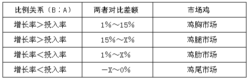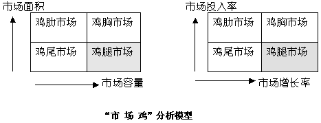 “市场鸡”分析法是一种非常形象的市场分析技术。这种方法主要利用企业内部的一些资讯数据,通过双项对比得出结论。同时,它也可以利用外部的一些资讯数据,或竞争对手的一些情报,通过双项对比得出结论。 “市场鸡”分析,主要是对区域市场的一种分析。 进行“市场鸡”分析,总共需要两组四项数据。 1、第一组数据: a、市场面积规模 b、市场容量规模 2、第二组数据: a、市场投入率 b、市场增长率 3、第一组分析方法 ① 我们把“市场面积”大,“市场容量”也大的市场,称之为“鸡胸市场”; ② 我们把“市场面积”小,“市场容量”也小的市场,称之为“鸡尾市场”; ③ 我们把“市场面积”大,“市场容量”小的市场,称之为“鸡肋市场”; ④ 我们把“市场面积”小,“市场容量”大的市场,称之为“鸡腿市场”。 4、第二组分析方法 ① 我们把“市场投入率”大,“市场增长率”也大的市场,称之为“鸡胸市场”; ② 我们把“市场投入率”小,“市场增长率”更小的市场,称之为“鸡尾市场”; ③ 我们把“市场投入率”大,“市场增长率”小的市场,称之为“鸡肋市场”; ④ 我们把“市场投入率”小,“市场增长率”大的市场,称之为“鸡腿市场”。