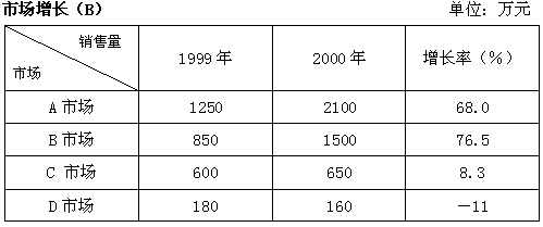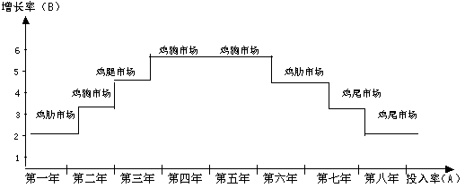根据“市场鸡”分析法: ① A市场的投入率基本等于增长率( B>A 5.5% )该市场属于“鸡胸市场”,应于保持并发展。 ② B市场的增长率远大于投入率,投入率为负增长,增长率却高速发展( B>A 109.8% ), 该市场属于“鸡腿市场”,应于保持并发展。 ③ C市场的增长率远小于投入率﹙ B<A 25%﹚ ,该市场属于“鸡肋市场”。麦卡尔公司是一家正在成长中的小公司,对该公司应于暂时放弃,等待时机。 ④ D市场的投入率保持未变,但增长率呈现负增长,﹙ B<A -11% ﹚,该市场属于“鸡尾市场”,应于马上舍弃。 市场模拟分析案例(二) 日本樱之厨株式会社是一家产销方便食品的大企业。该企业于20世纪70年代在本土方便面市场上独领风骚。但在经营八年时间后,该企业的产品逐渐退出了市场。纵观其市场发展变化,其“市场鸡”变化形势如下: