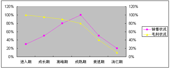 以上图例说明如下: 1、 假设整个圆形表示一个具体的分类:100%纯果汁 2、 每个扇形区隔表示分类里的口味细分 3、 扇形区旁的数字表示该口味里的具体商品支数 4、 A、B大小圆形表示商品的不同重要程度 A:此口味里的核心单品(最好卖的,不轻易淘汰的) B:此口味里的配套单品(一般销售,可根据需要调整) 采购就是依据此来做商品的引进淘汰工作的。 另一方面,我们知道任何商品都是有一定的生命周期的,一般都会经历 进入期→成长期→高峰期→成熟期→衰退期→消亡期 在这个过程中商品的毛利也是不同的。通常在进入期和成长期的毛利是最高的,随着竞争的加剧促销力度不断加强,价格下降促销成本增加,毛利减少。在高峰期和成熟期的毛利会维持在一个平均水平,其后竞品增多销量下降,价格战越打越深毛利也就越来越低。因此,为谋求合理利润,厂商通常会在旧品的高峰期、成熟期就开始研发推出新品,以更新日渐微薄的利润结构。同样的,越成熟的商品,市场价格越透明,卖场为保持价格竞争优势也在不断压缩自己的毛利空间。必须靠新品的高毛利才能使整个商品结构保持合理的毛利结构,不然卖场将无法损益平衡。因此,引进、汰换商品是优化毛利结构的一个重要手段。 用以下图例来说明商品不同成长周期的利润情况: