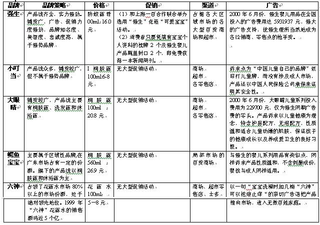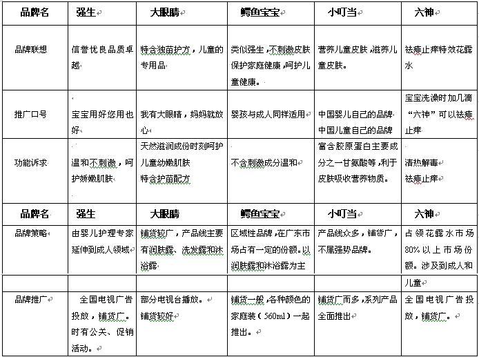 A、 市场空间大,竞争对手少,前景好。 据中国计划生育年鉴资料:中国一天生5.3万个小孩,一年净生1500-1800多万人口。我们定位于婴幼儿市场(1-3岁),每年至少就有5000万人口的市场容量。由于是消费品,顾客需要反复消费,故每年的市场容量远远大于5000万。 如此大的护肤市场,却被众多商家所忽视,相对于竞争白热化的成人护肤用品市场而言,婴幼儿市场要平静得多; B、竞争格局已初见倪端.。强势品牌统领市场,弱势品牌无力争锋 在国内,婴幼儿用品市场仅为少数几个品牌所统治,尚未出现百家争鸣的现象。其中强生依靠其强大的实力成为独占鳌头的霸主:笔者甚至在武汉爱得利婴儿用品专卖店也看到强生的身影,解释是顾客点名要强生,店家不得已才进货撑门面。在广告投放上,强生的费用也无人能及。据资料了解,2000年6月份,强生婴儿用品在全国投入的广告费用达5,931,937元。而排名第三的大眼睛儿童系列投入费用229,700元, 仅相当于强生的零头。强大的广告支持,使强生理所当然地成为各经销、零售点的抢手货。 . C、大人接受使用婴幼儿产品成为事实。目标市场拓展至成人消费群已成为婴幼儿用品又一生长点。 婴幼儿用品因其温和无刺激而越来越受到成年女性的喜爱,商家敏观其情,迅速出击,将婴幼儿用品延伸到成人领域。笔者在武汉调查过程中,一位选购强生婴儿用品的妇女告诉我们:她长期与宝宝共用婴儿洗浴用品。“宝宝用好,您用也好”,成为众多婴儿用品厂家开发成人领域的口号 D、婴幼儿用品消费观念薄弱。 尽管厂商生产的婴幼儿用品愈来愈丰富、愈来愈系列化;实际上,大多数市民对婴幼儿用品的概念还停留在初级阶段。在农村,许多家庭用来护理婴幼儿的产品通常只有花露水和痱子粉;婴儿润肤露、沐浴露对他们来说算是奢侈品。只有在经济相对发达城市,许多年轻父母亲才注意用成套的婴儿用品加强对婴幼儿的呵护。 E、市场上没有专业婴幼儿护肤日用品的强势品牌,尚有空隙! 尽管强生在婴儿日用品这块有先入为主的优势。但是强生业务范围广。涉及医疗器械、隐形眼镜、溃疡药、泰诺镇痛剂、强生婴儿和成人用品等各类市场,属于世界上最大的健康护理产品的生产商。并非专业的婴幼儿护肤日用品生产商。象知名度高的六神,也涉及到婴幼儿市场,但主要还是做成人市场。还有小叮当定位于中国儿童的品牌,鳄鱼宝宝定位于儿童家庭装。专业的专门生产婴幼儿护肤品的厂家目前仍是空白。 二、关于品牌 一个品牌包括品牌知名度、忠诚度、美誉度。从品牌的联想、品牌的定位、到功能诉求、品牌策略、品牌推广等都是一个系统的工程,缺一不可。我们可以从竞争对手的品牌推广方式看出竞争对手的营销战略、竞争策略。从而更好地为自己品牌正确定位。