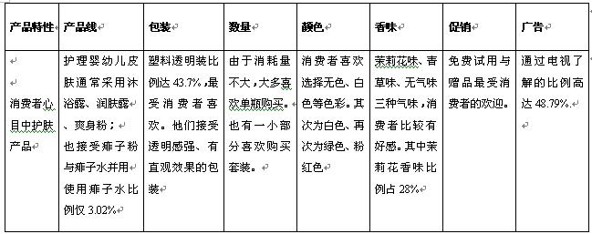 综 述: 从上述列表不难看出,强生作为婴幼儿护肤用品市场的行业霸主,占据了绝大多数的市场份额,而其它几个弱势品牌虽然在区域市场有一定的份额,但总体而言,没有形成大气侯。无论是在广告投放或者是促销力度上面,婴幼儿市场波澜未兴,除了强生一枝独秀以外,其它品牌并未出现强有力的整合营销传播策略。而六神作为花露水市场的第一品牌,也奠定了其霸主地位。总而言之,婴幼儿护肤品市场,还未出现多雄争霸局面,市场空间巨大,为后来品牌的切入提供了一定的市场契机。 五、关于营销组合 (一)、产品方面: 通过市场调查,我们得出消费者心目中的婴儿护肤产品,具有以下特征: