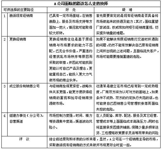 通览案例,我认为就A公司实情及其安徽市场目前所处的窘境而言,激活现有经销商是一条更适宜A公司做好安徽市场的思路。 激活现有经销商,是更适宜的思路 阅过案例,我们可以看出,A公司正在面临:如何从多条路中选择出最适宜自己的那条路的烦恼抉择。 我认为,类似A公司这般面临渠道整改的企业,最终能否抉择出最适宜自己走的那条路,都需要秉承如后几个原则行事:一是能否平稳过渡市场,与原有市场基础进行一定程度的嫁接,而非完全舍弃与重建;新旧措施之间的好处是否具有不可替代性,所需付出的代价是否有能力承受;是否与企业的资源供给能力、对风险的直接承受能力、服务能力等相适应;新抉择是否是自己目前所能做到的,实施条件是否已经具备,是否具有一定的前瞻性;新的抉择如果不能带来与切实体现更多的好处,至少也能有效规避以前的一些问题,而不是再带来一些新的难题。 现在,就先让我们来看看摆在A公司面前的几条路。
