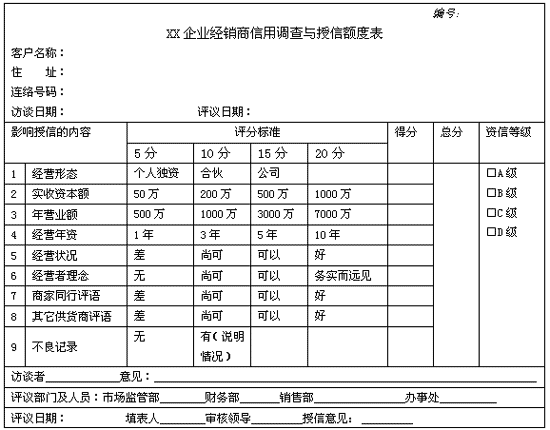 事实上,在案例陈述中,我们也不难发现,并不是A公司现有的经销商伍老板、李老板不具备将A公司产品市场做起来、销量提起来的实力,而是在里面掺和着:要求铺底和现款现货政策的矛盾;三包理赔要强硬到底还是应该灵活应变的矛盾;自己产品与其它厂家产品在经销商处抢资源、争重视的矛盾;等等。显然,A公司真正所需要的就是如何化解自己和现有经销商之间的矛盾,令它们雄起将市场激活。 让经销商雄起,可能将市场激活;将市场激活了,也可能使经销商信心和兴趣倍增,从而在自己产品的重视程度和资源偏向上雄起。当然,在本文中,让经销商雄起更多讲的是通路激励和市场支持的问题,而将市场激活则是扩大了市场视野,更多讲的是如何打击对手、形成下游渠道和用户市场对经销商的拉力。下面,结合起来阐述。 一、A公司有必要尽早对其现款现货、三包理赔等销售政策进行适当的调整,当然,要用对经销商资信及授信额度的有效评定来设定一定的安全防线,以便对经销商进行安全的激励。 可到底又该如何对商家开展资信授级工作呢?下表是某企业的经销商信用调查与授信额度表,不妨结合自身情况进行一定的借鉴。