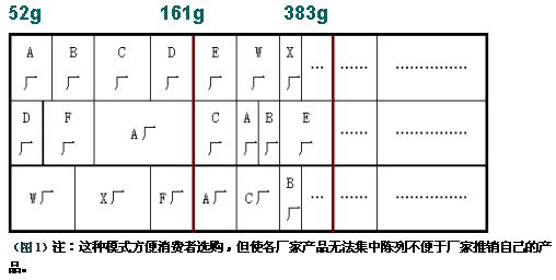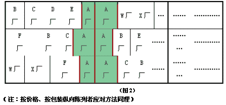 应用对策: 同一规格区内尽可能使自己产品“上下打通,竖直排列”,利用两规格相邻位置让自己的两个规格产品紧邻摆放从而形成集中陈列效果。(如图2)