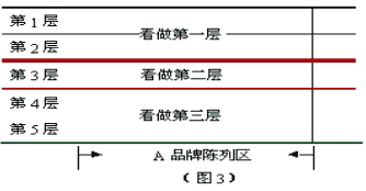 (3)按品牌集中(超市给各厂家画出一块位置,同一厂家产品集中摆放)超市陈列技巧。超市货架一般是四层——六层,最有效的货架是中间几层(100CM-170CM),此时如果完全采用按横向陈列(一层货架横向陈列一个品项)势必造成最高层、最低层货架上产品无法占据有效陈列位;而完全纵向陈列(各品项竖直排列)同时要保证每个单品不少于两个陈列面,又会由于商超给的陈列空间有限无法全品项陈列。 应对策略:采用横纵交叉陈列法: ①尽量让每一个条码都有一个有效陈列面; ②不被现有货架层数蒙蔽,以有效陈列的眼光对现有货架层数重新定义。 例:如图3所示超市货架共5层,以有效陈列的眼光可将该超市货架层数重新定义——看做三层。