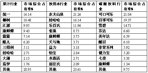 2003年是饮料行业的果汁年。在碳酸饮料、瓶装饮用水、茶饮料三大品类几年来相继掀起市场热潮以后,果汁饮料以健康时尚的形象成为饮品市场的新宠。去年以来,市场空间进一步扩大,各大饮料巨头纷纷挺进果汁市场,行业门槛也进一部提高。新进入者想要有所突破,除了比拼资金、设备、原料等因素外,营销策略的水准也将成为胜败的关键。 饮用水行业擅长营销创意的农夫山泉今年也推出了果汁产品——农夫果园,并在激烈的市场竞争中打赢了第一战,获得可观的市场份额,其运用的差异化策略值得进入果汁领域的企业学习和借鉴。 果汁市场虽缺大佬,但竞争门槛已提高 果汁行业前景十分看好,统计数字表明,美国人年均消费果汁为45公升,德国为46公升,日本和新加坡为16—19公升,世界人均消费量达7公升,而我国人均年消费量仅1公升,国内果汁市场的增长空间很大。从市场现状看,果汁行业发展迅猛,消费者的选择率超过35%,2002年市场容量达到200万吨,并且一直保持两位数的增长幅度。 但就整个行业分析,目前还缺少强势的领导品牌。3月底中国全国商业信息中心发布一份报告显示,果汁市场排名前十位的品牌没有一个市场综合占有率超过20%,而同为饮料行业的瓶装饮用水、碳酸饮料,市场集中度则要高出很多,前三位的领导品牌市场占有率明显高于其他品牌。(见下表)