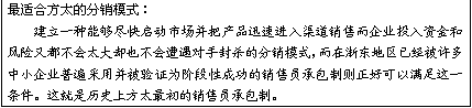 最适合方太的分销模式:建立一种能够尽快启动市场并把产品迅速进入渠道销售而企业投入资金和风险又都不会太大却也不会遭遇对手封杀的分销模式,而在浙东地区已经被许多中小企业普遍采用并被验证为阶段性成功的销售员承包制则正好可以满足这一条件。这就是历史上方太最初的销售员承包制。 经过分析,方太决策层认为,渠道或分销模式无所谓好坏,关键是适合和适用。在不同的阶段,企业需要设计不同形式的营销渠道结构。 在创业初期,方太需要的是一种能够尽快启动市场进入渠道销售而企业投入风险又不会太大的分销模式,这就是销售员承包制的诞生。